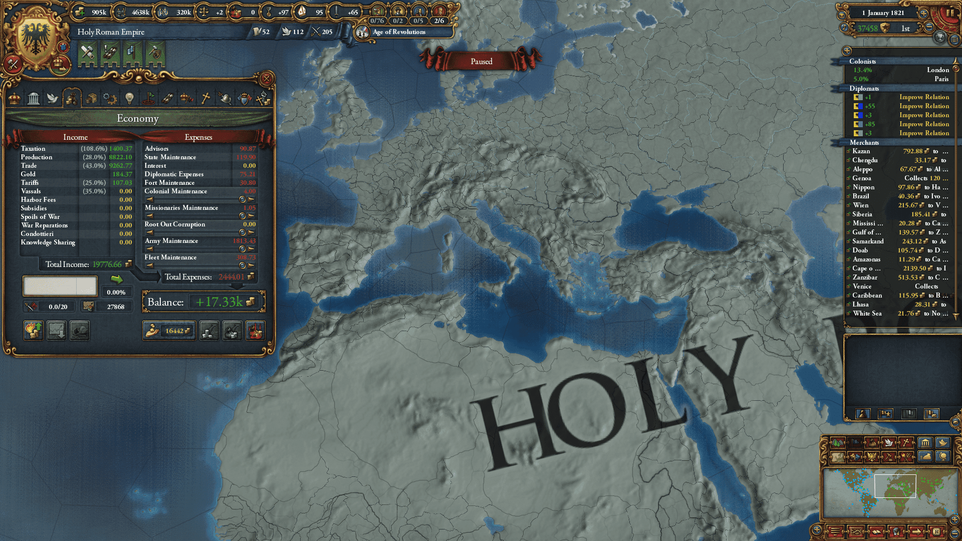 自治率は操作可能な州がなかったので、おそらく全ての州が自治度下限に達したと思う(西欧のステートが0%、貿易会社州が55%)