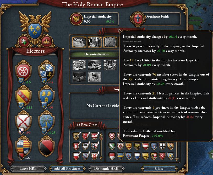 帝国インシデントの仕様をよく理解しておらず、単に多数派の選択肢が議決されるものだと思っていた 実際には決定権はHRE皇帝(つまり今回はFrance)にあり、Franceの決定が少数派であれば画像のように"Menbership is not opitional."と表示されるらしい さらに選択内容によるIAの増減(今回ならば離脱容認を決定するとIA-10)とは別に、多数派ボーナス/少数派ペナルティがあり 今回は離脱容認派が大多数だったため、Franceが離脱を容認していればIA+9.20/離脱を認めず開戦するとIA-9.20だった つまり純粋に「選択によるIAの変化」のみを見ると、離脱容認なら-10+9.2=-0.8、開戦なら-9.2で離脱容認の方がマシだったことになる (講和時にExpand_Empireを選択すればSwitzerlandの再加入でIA+10されるため、その場合差し引きで+0.8にはなる)
