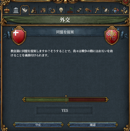 ところで戦争中に教皇様からスイス傭兵の要請(イベント)がありまして教皇様と我々の関係は蜜月を迎えています。というわけで教皇領と同盟を結びます。ついでにヴュルテンベルクを攻めるにあたりアンスバッハとも同盟します。