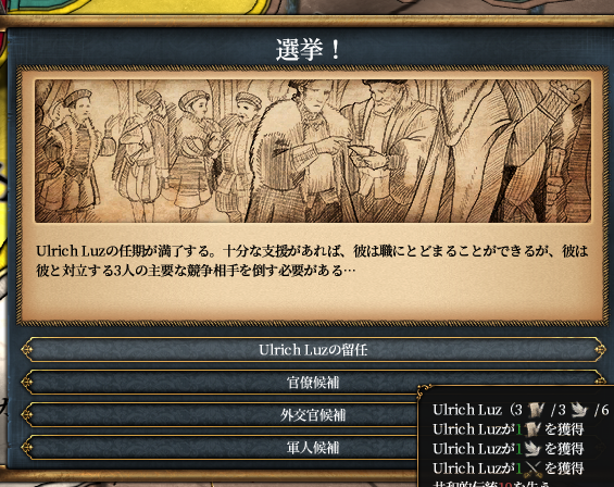 戦争中にまたウルリヒの任期が来ました。一部共和派が彼を失脚させようとするも兵士たちから根強い支持を得ているウルリヒに表立って対抗する者は現れず、反ウルリヒ有力者はアルザスのスパイ疑惑をかけられ粛清されます。もちろん続投。