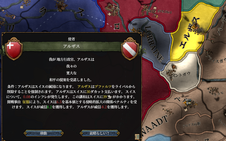 アルザスは属国にします。こいつLv.3要塞持ってるので戦争時に時間稼ぎの役に立つんですよ。で、次が非常に大切な戦争になります。