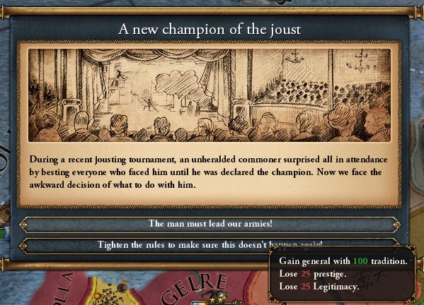 馬上槍試合に突然現れた謎の平民が試合相手を次々と倒し、優勝しちゃったもんだから対処に困ったというイベント