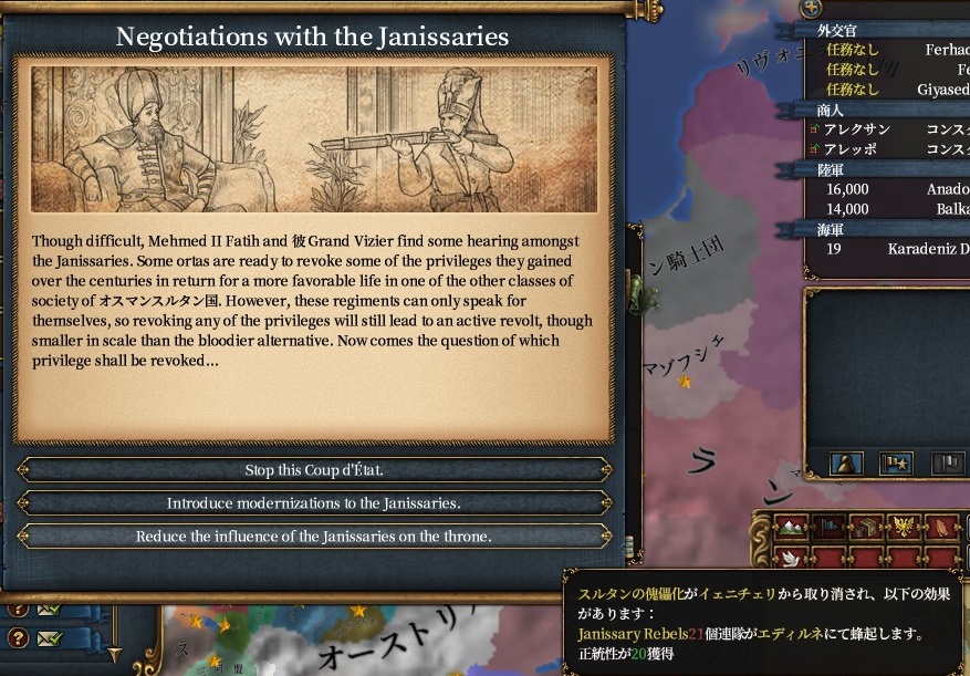 そして、イェニチェリ国難が発動したら、イェニチェリの対峙ディシジョンの3つすべてを実行して、反乱を起こさせます。