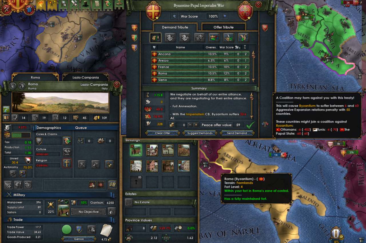 実のところ、2019年発売のパラドの新作「Imperator: Rome」発売決定ということで、本AARのあとがきは「Basileus達成後革命を起こして共和制ローマに移行」というおちを作る予定でしたが、Disaster発生年度的にGC終了まで間に合わないので結局教皇とオスマンを殴って終わりとなってしまいました。