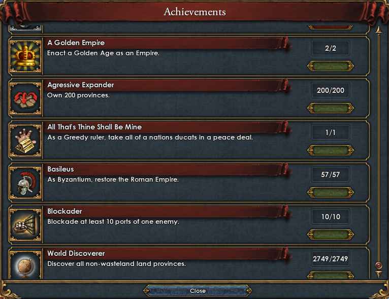 画像の6個+Truly Divine Ruler(5/5/5以上のRulerを獲得せよ)の7個。Truly Divine Rulerはテストプレイ中に獲得したものなのでここには含まれていないです。これはイベントでぽろっと出た6/6/6君主が即位して獲得したのですが、本プレイ中で出てくれればどんなに楽だったことか・・・