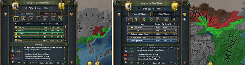 1446年には両者ともに終結。建州戦では途中から朝鮮と海西が慌てて対建州宣戦していましたが、我々は朝鮮に取られる可能性のある東国境・海岸を最優先で抑えることができました。