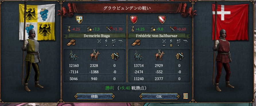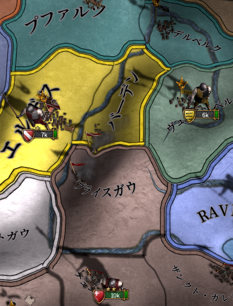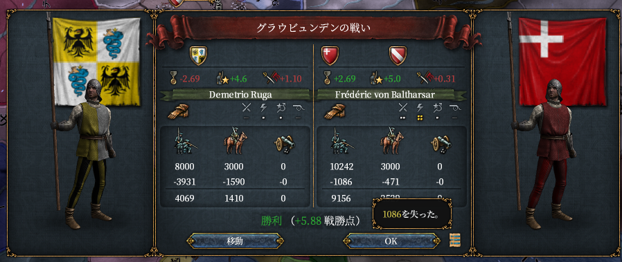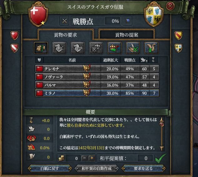 バーデン陥落前後で二回撃退しました。その後ミラノを包囲すると厭戦機運が高まったのか、ミラノは陥落を待たず白紙講和。盟友アルザスと邪悪なるバーデン公の領土を南北に分断します。