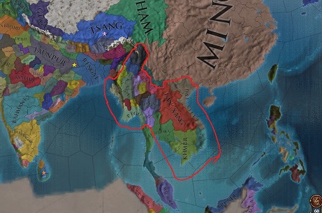 この2国を併合できれば一気に楽になる。(属国が0になると強力な公爵領の特権が外れてしまうので、併合が完了する前にラーンナーなどを属国化しておこう)