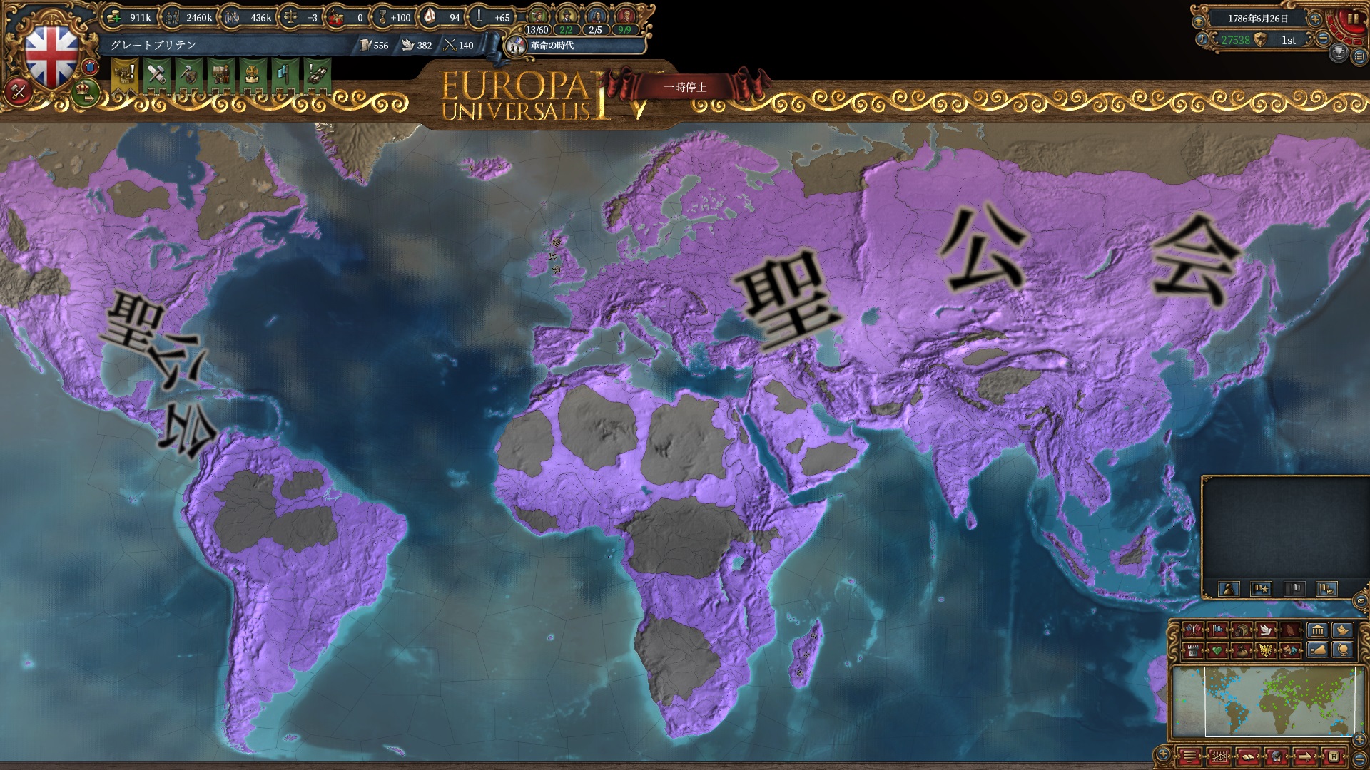 神権制の戦勝点圧縮+イギリスの外交併合力+聖公会の高評価維持力は各々の間でシナジーを生み終盤の拡張力を大いにサポートしてくれます。