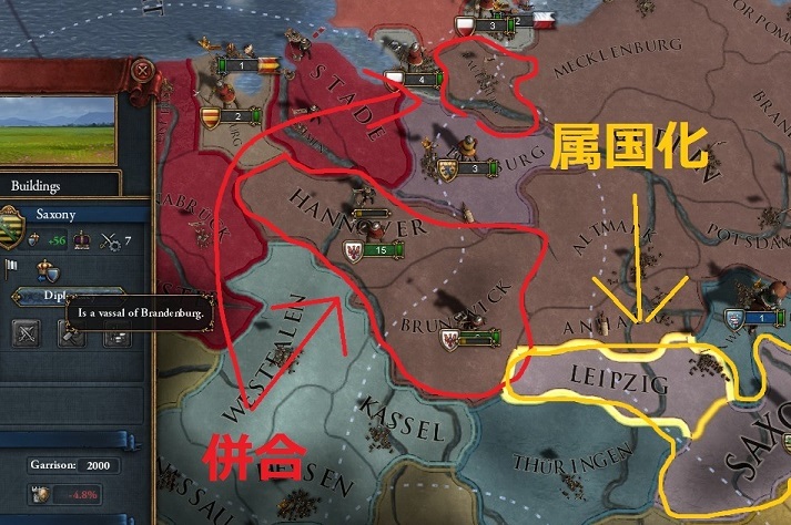 F: 個人的に「併」って漢字の形が好きなんだ。ちなみにThe Hansaを属国化したのはBase Taxが高く、Admin Powerを根こそぎ持っていかれるのが嫌だからだ。