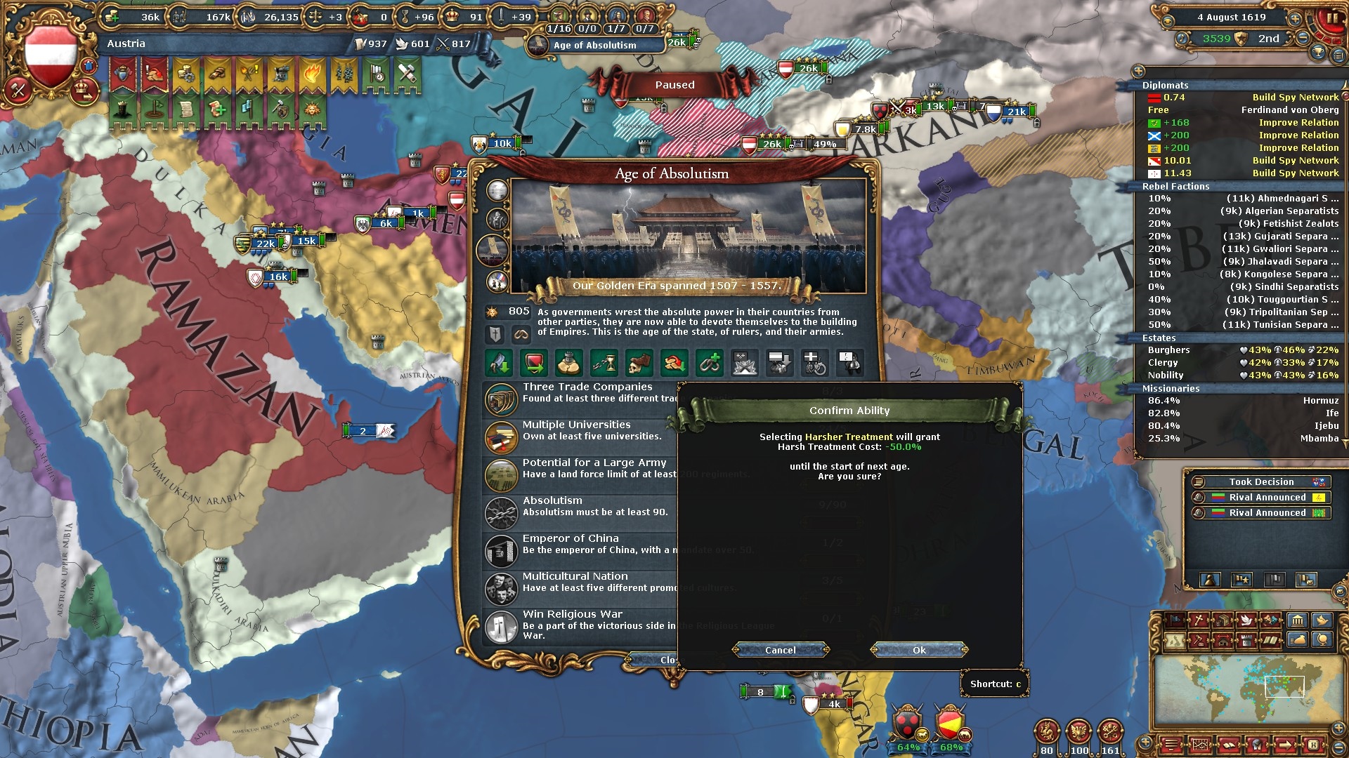 オスマンAARの時と違い神聖ローマ帝国ファンネルプレイでは、自国領を少なくできるので改革ポイントを稼ぐことが可能となります。