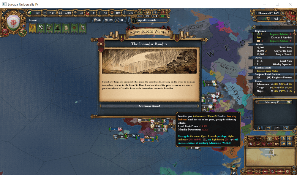 この機会に、「冒険者募集!(Adventure Wanted!)」システムについて説明します。このイベント群は、害をもたらす存在が領内に発生し、排除するまで該当プロヴィンスにデバフを与え続けるイベントです。