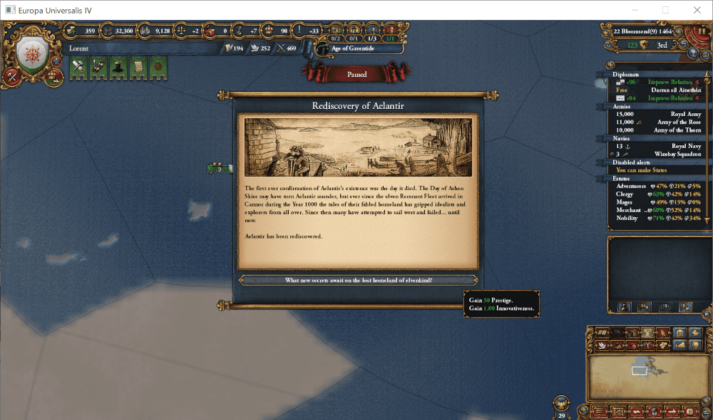しかし、災害が発生したのは遥か昔の事であり、Cannor大陸の西端に位置する国として、Aelantir大陸の探索をするのは必然的と言えます。探検家を小型船に乗せ、嘆きの海を探索させます。