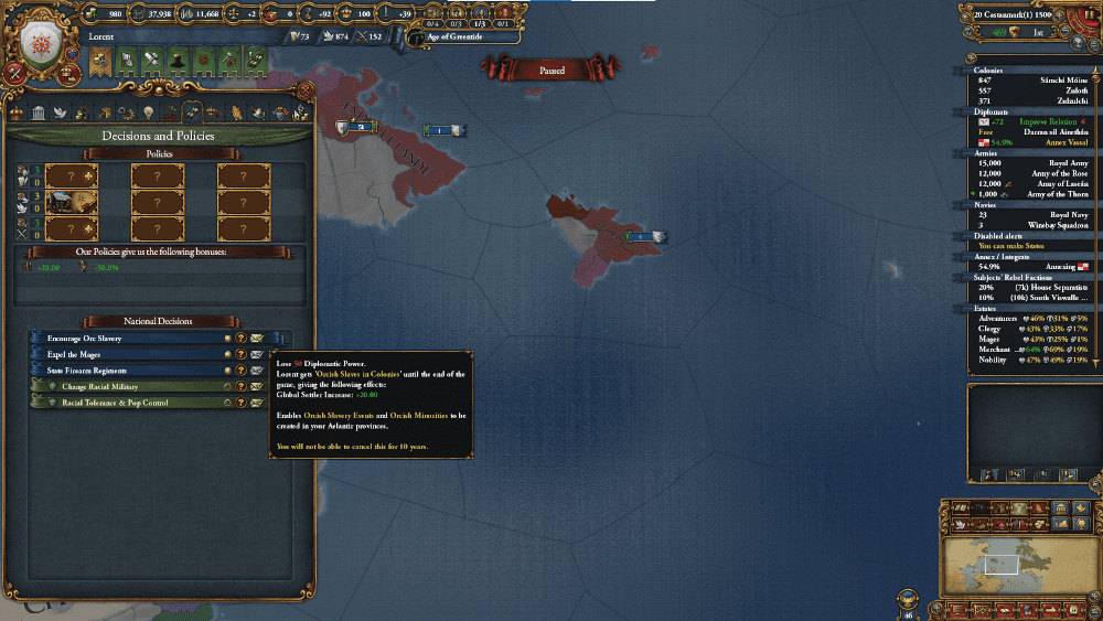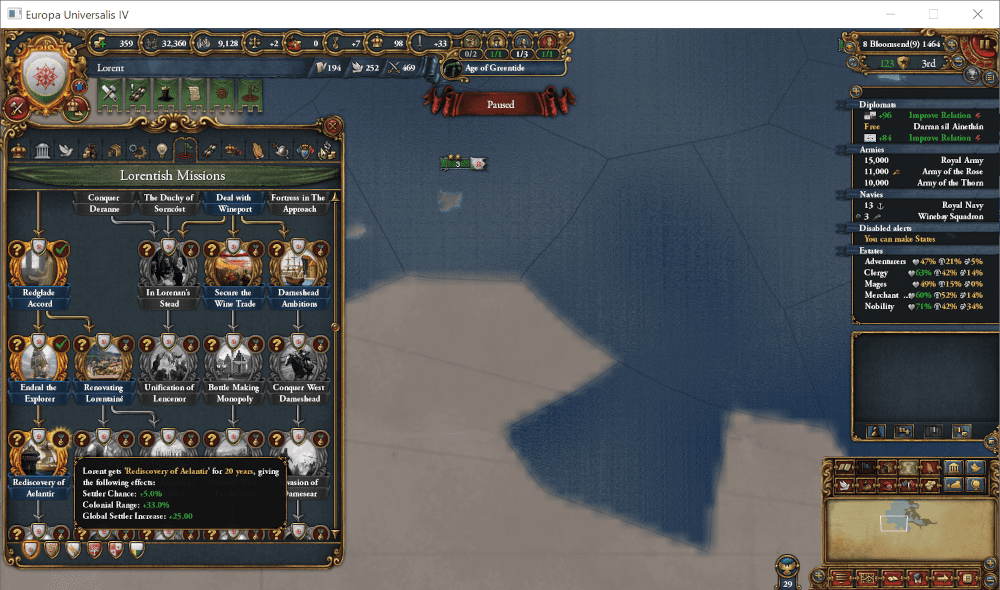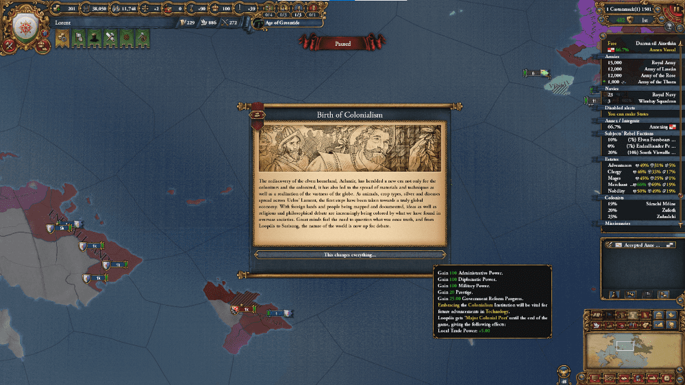1465年10月、財政には余裕があるので2つの植民を同時並行で行います。また、この頃から他国でもAelantir大陸探索と植民が活発化し始めました。現時点でDeranne公国とVenailエルフ王国が植民活動を行っています。