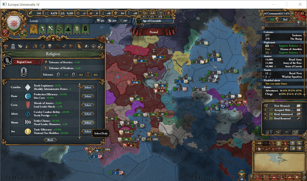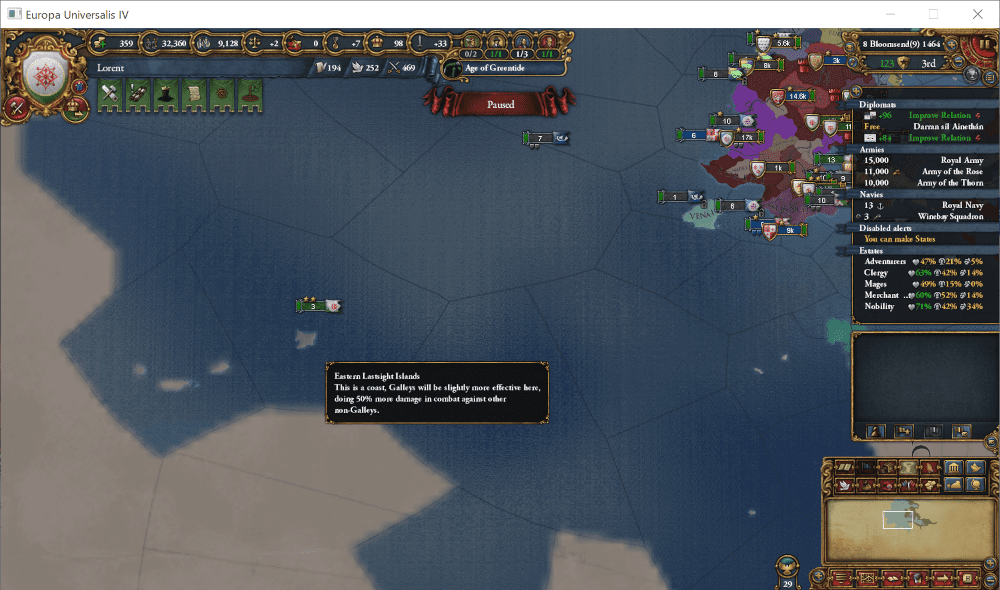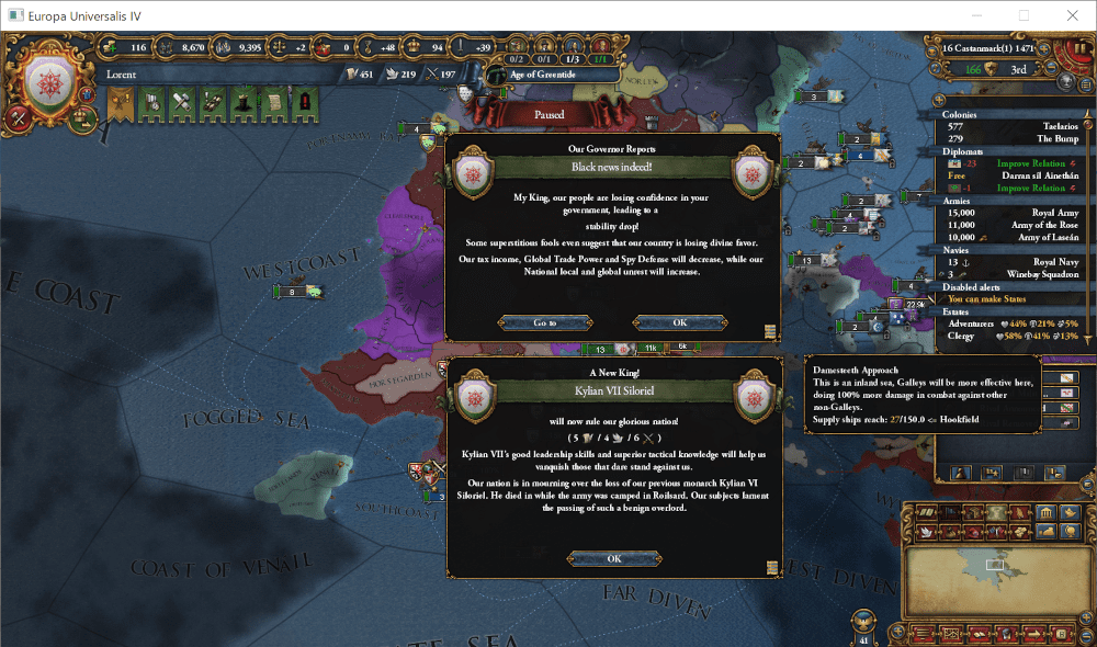 1466年11月、Anbennar皇帝にしてWex大公が死去、新たにIstralore選帝侯が皇帝に就任しました。この国は紫丁香花戦争において我々と争った月派(Moon Party)の統率国Dameria大公国の、事実上の後継国です。帝位を奪われてしまったことは遺憾ではありますが、今争うのは得策ではないため、放置します。