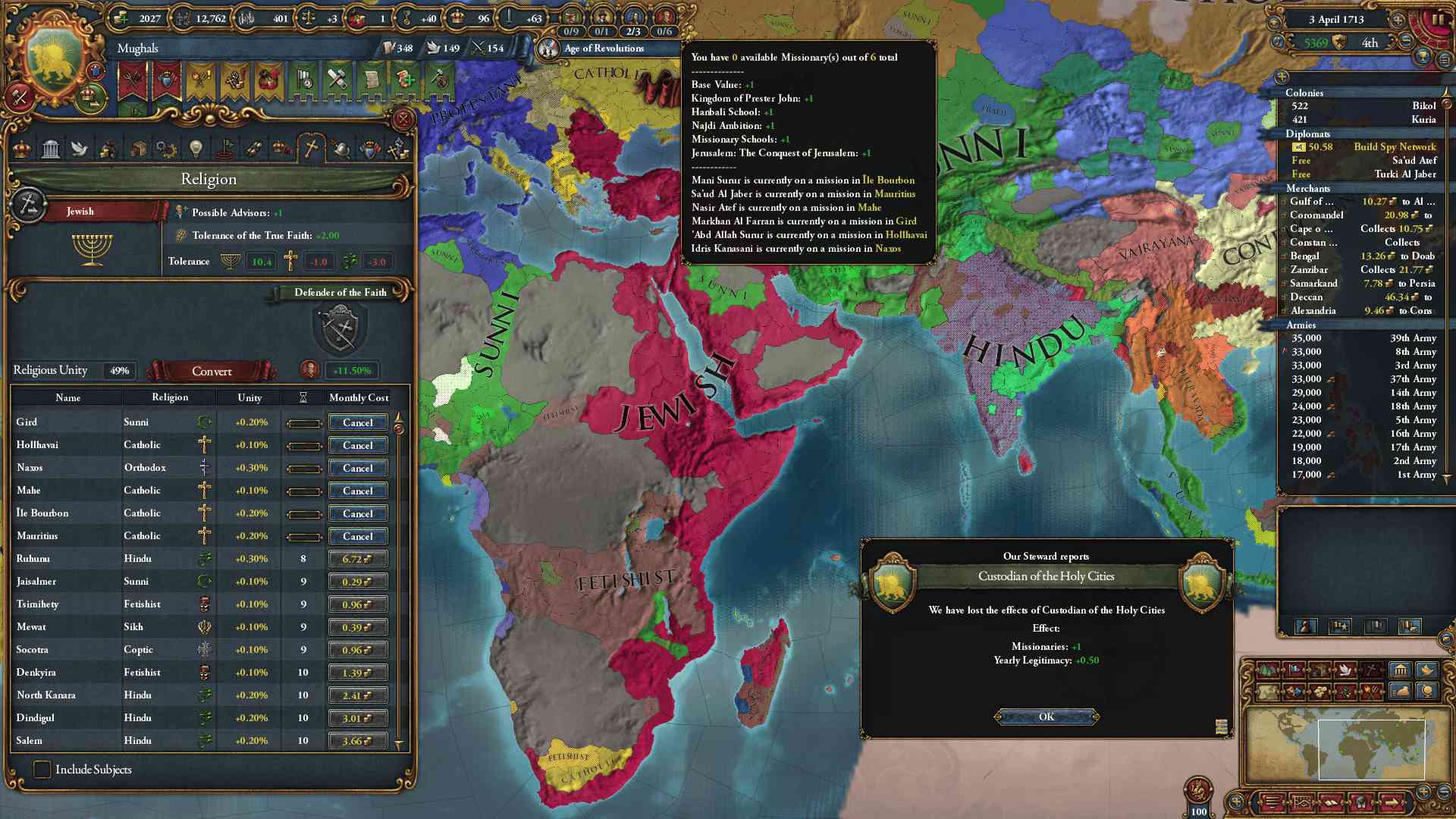 - ムガル化を狙うとインド制圧後に宗派替えとなり手間がかかりますよね。宗教NIを持つ国(カスティーリャ等)でペルシア化を行い早い時期からユダヤ教を布教するのはどうでしょうか?Feudal Theocracy政体ボーナスで追加の宣教師と改宗強度への補正も付きますし --
