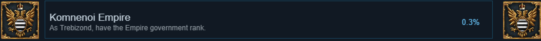 このトレビゾンド帝国、帝国とは名ばかりでゲーム上開始点では王国に設定されており、実績(Komnenoi Empire)解除のためには政体を帝国ランクに押し上げる必要があります。