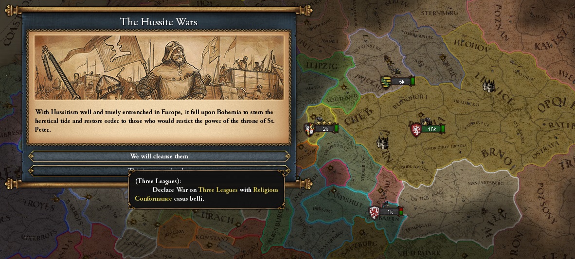 パッサウとの戦争も、メイッセンとの戦争も、どちらもたいした波乱なく、ほとんど暴動鎮圧と同じ調子で戦勝しました。賠償金と陸軍伝統値を得てボヘミア軍は凱旋します。