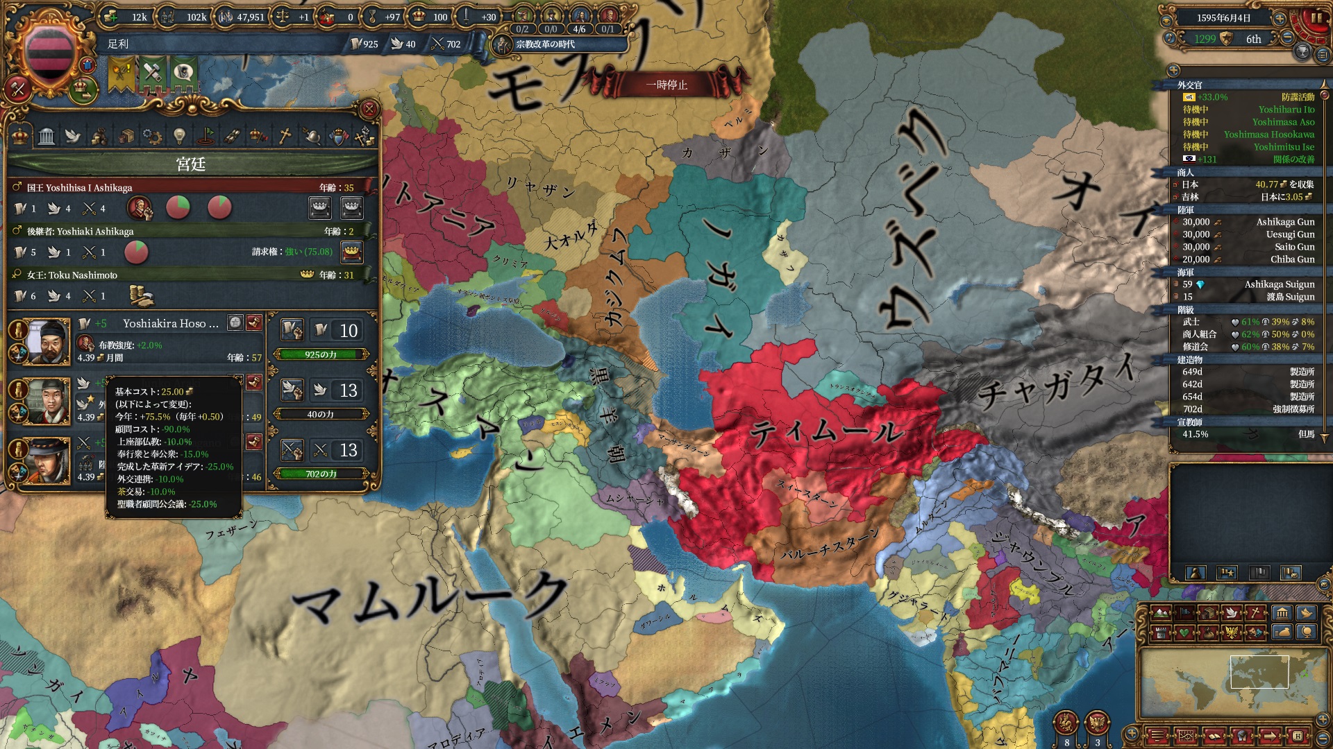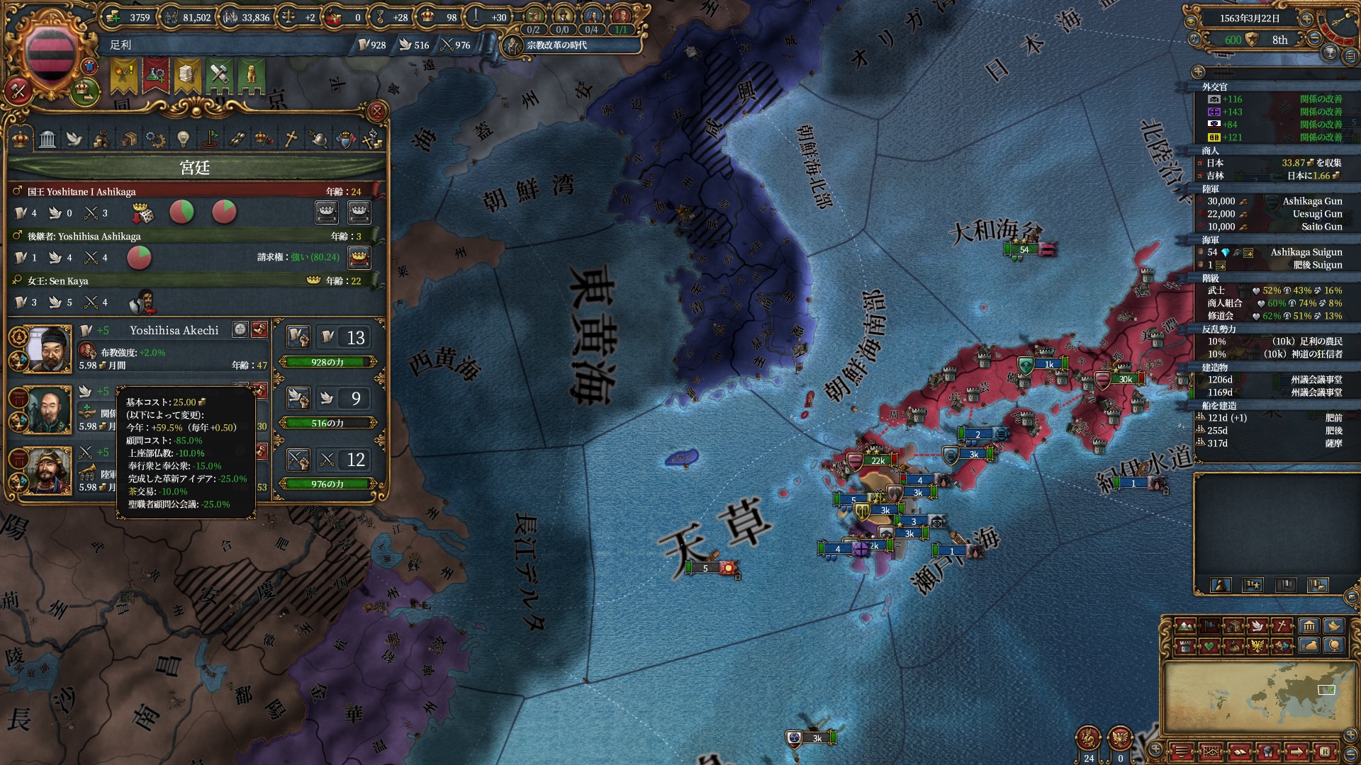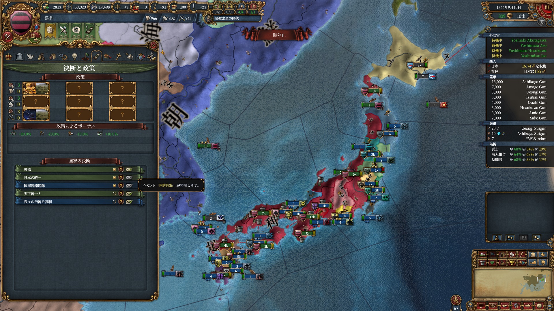 ここらで足利のNI「奉行衆と奉公衆(顧問コスト-15%)」が得られるようになりました。