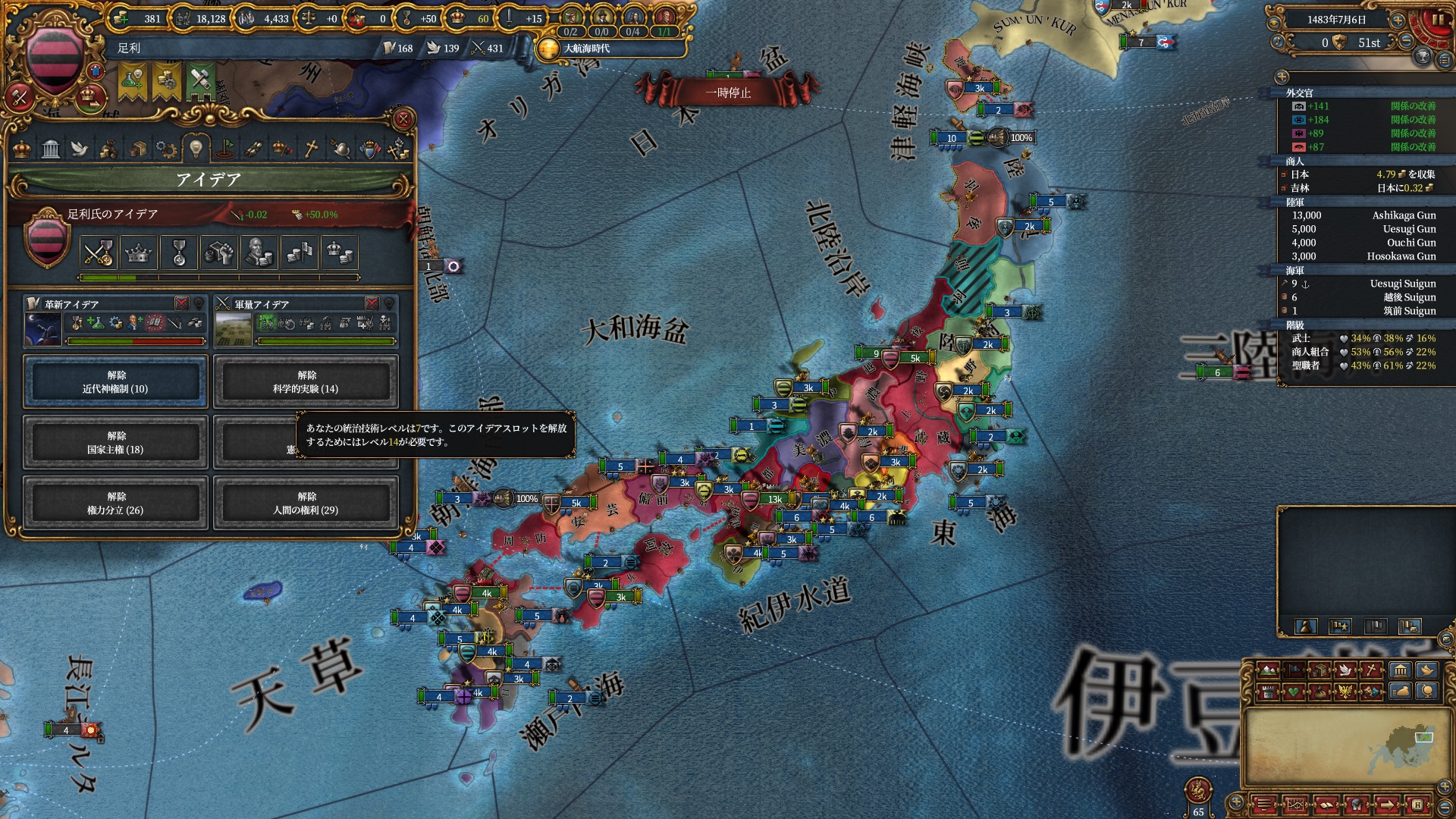 4個目のアイデアに外交を取得し大名の併合を急がせます。