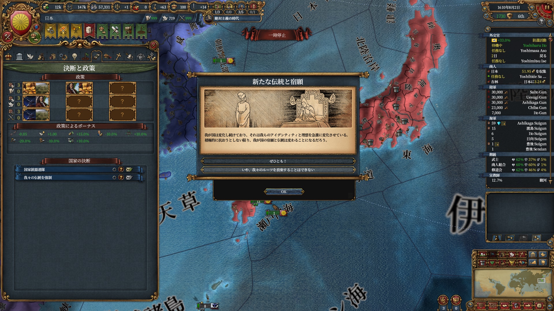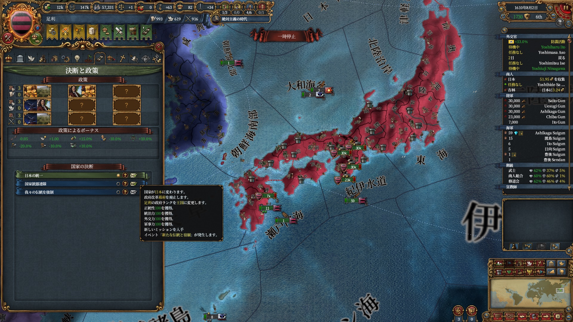 その際に革新+外交のポリシーで顧問コスト-10%を取得しましたが、どうやら-90%が限界らしいです。