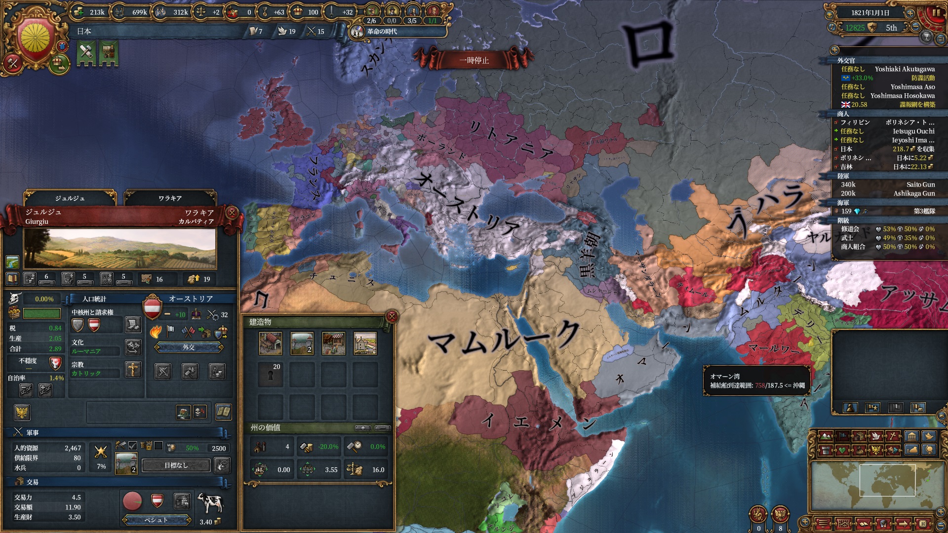交易力の計算では州のdev値も直結するため日本の交易力は極めて高くほぼ独占状態。最後交易保護艦隊は吉林の保護で無理矢理富を吸いだしてました。