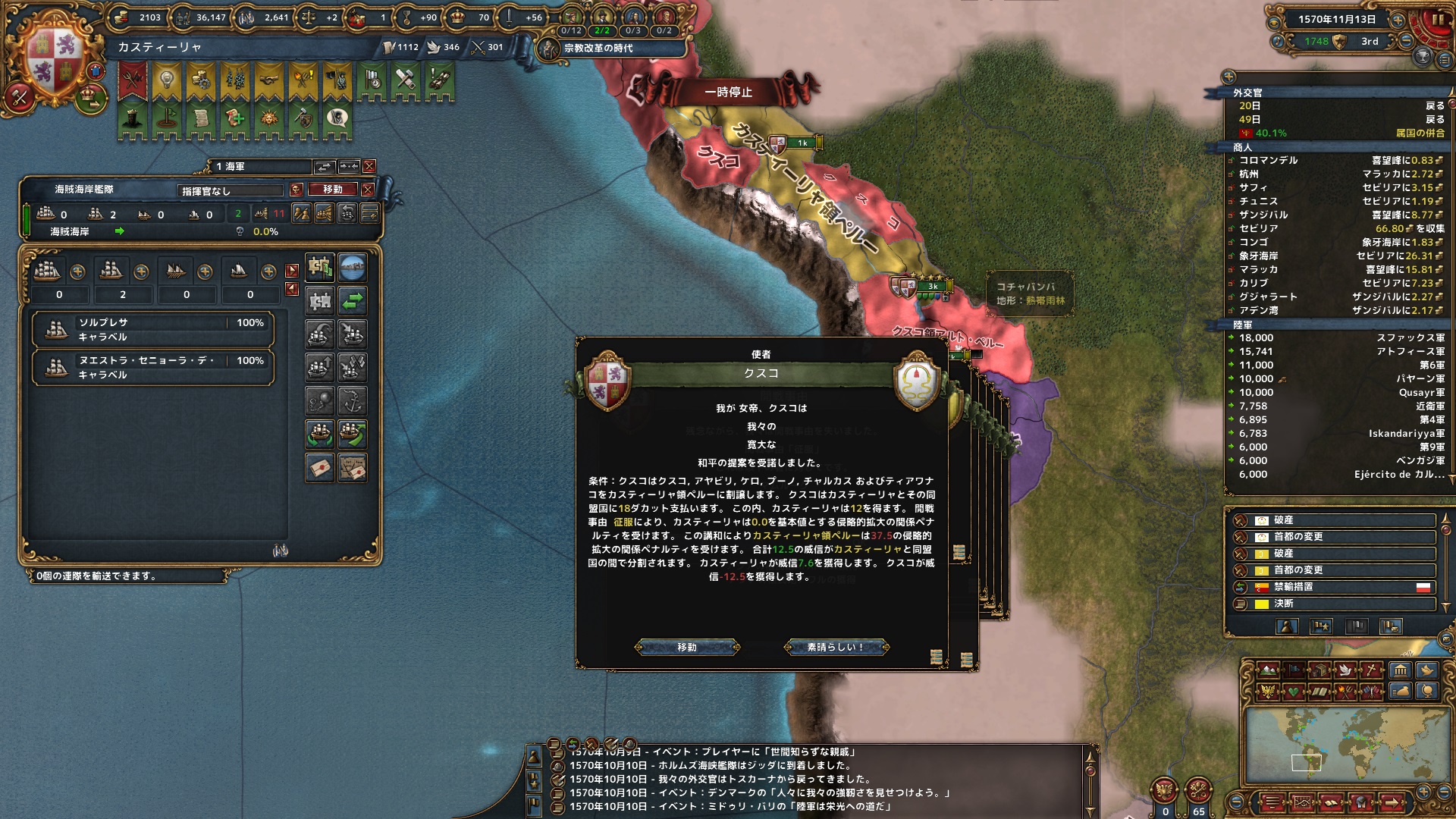 同月、裏でやっていたムイスカ戦は、進捗が悪く白紙和平とした。平和期間確保のために。