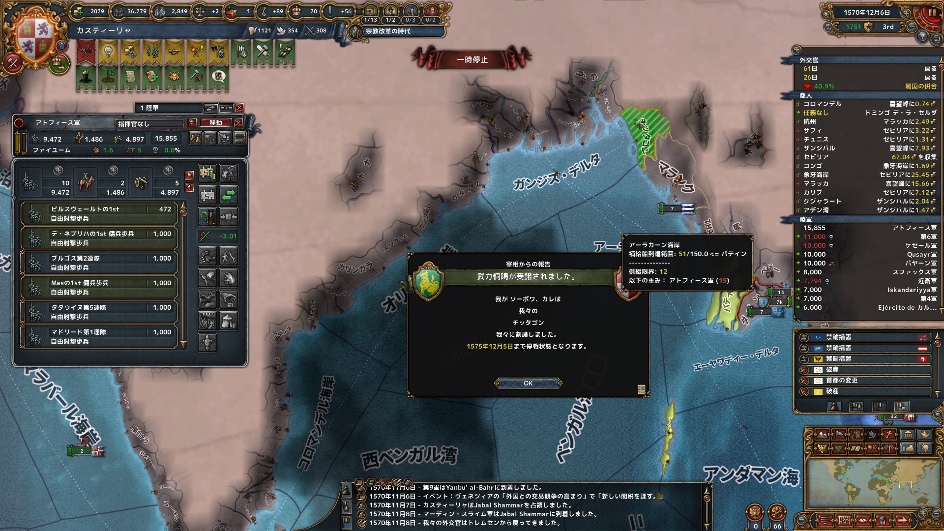 12月 和平期間になったところでカレからチッタゴンを武力恫喝。