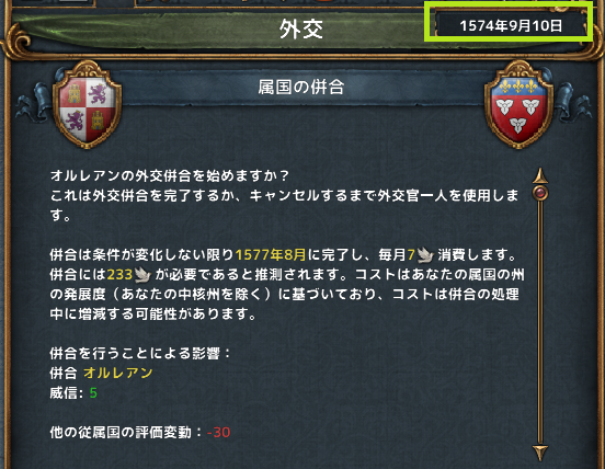 9月、オルレアンの併合を開始。ノルウェーの併合に時期を合わせ、効率的に外交枠を空けたい。