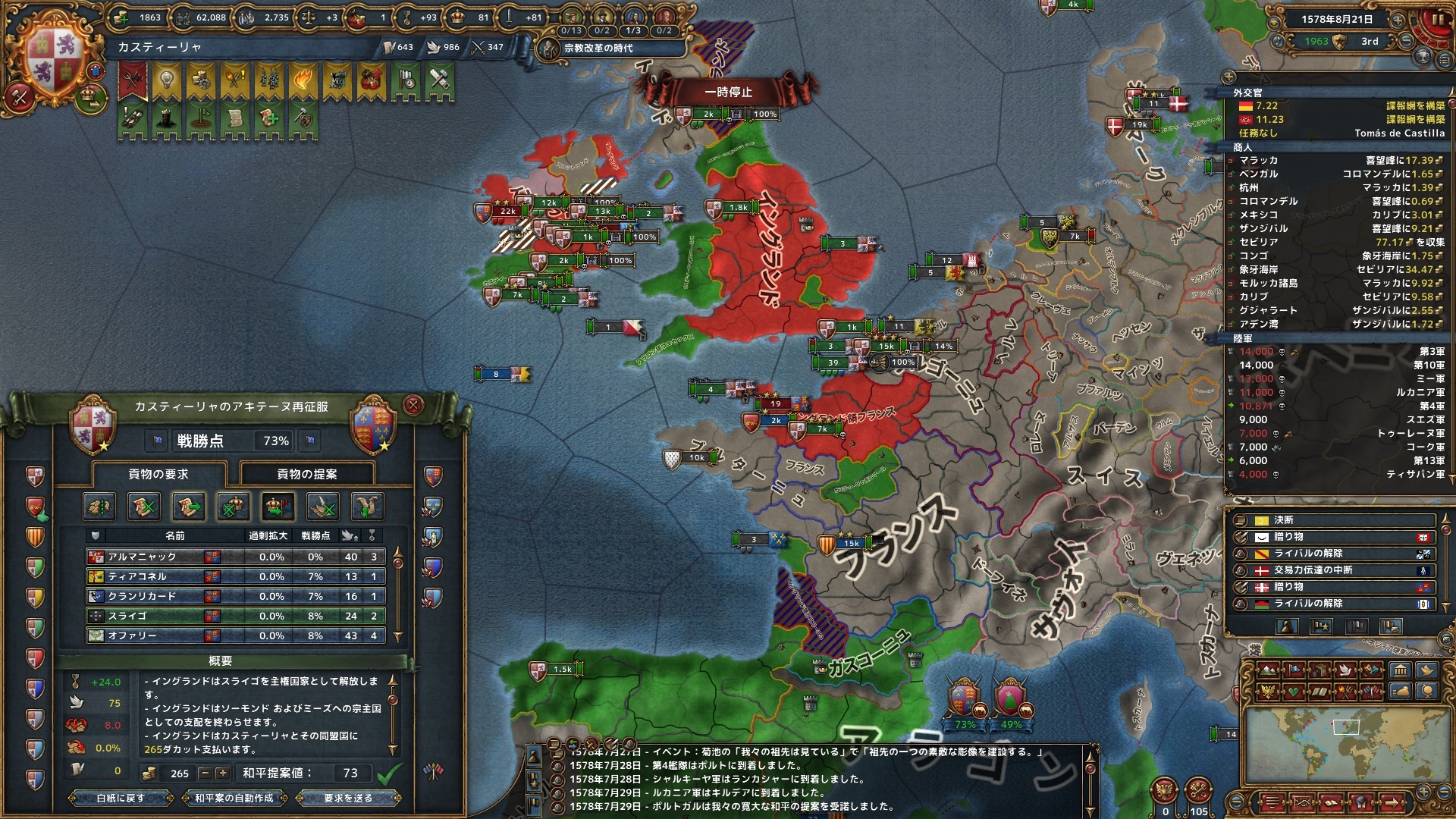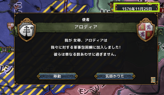 1月 オルレアンを外交属国化。西ヨーロッパではAEの上がり方がとんでもないと分かり、可能な限り外交的に拡大することを試みる。再征服の利用についても集団を講じ始める