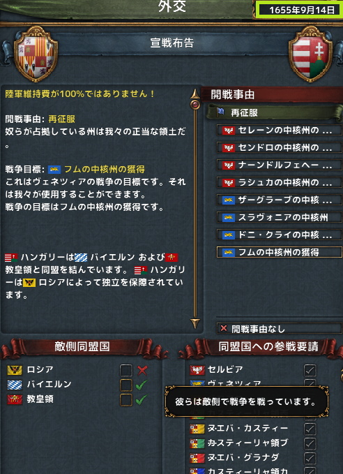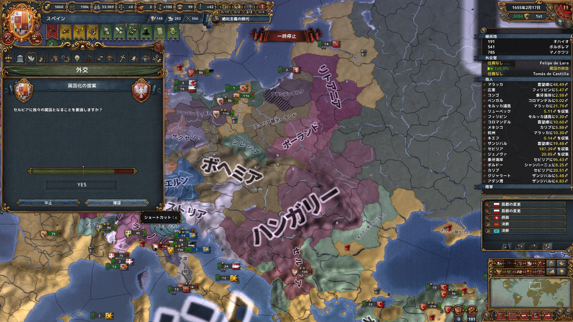 同時期に、セルビアを外交属国化する。オスマンからのコア返還が有効にはたらいた。さらに周辺国への再征服CBも手に入る。