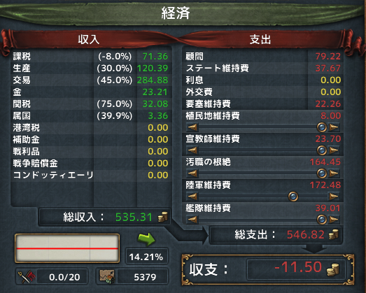 絶対主義前は属国コア州の再征服によるAE低減が必須級の重要度だったが、今ではAEが飛ばなくなり、包囲網予備軍の各国軍も問題にならなくなってきてAE対策の意味が小さくなった。