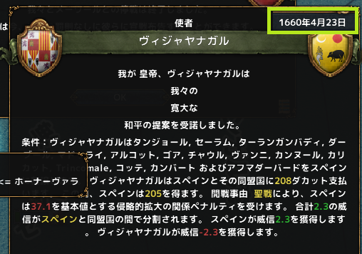 4月 ヴィジャヤナガルと停戦。14州くらい(?)割譲させる。
