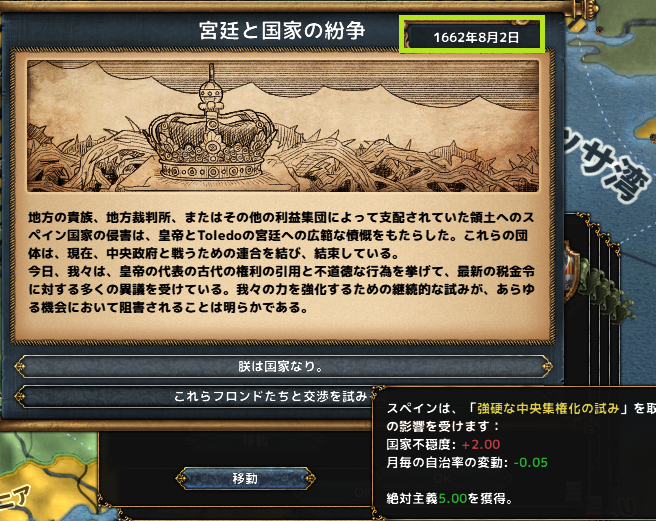 8月 宮廷と地方の国難のが発動。絶対主義の時代に入った時点で、安定度が高すぎ、国難の開始条件をなかなか満たせなかった。