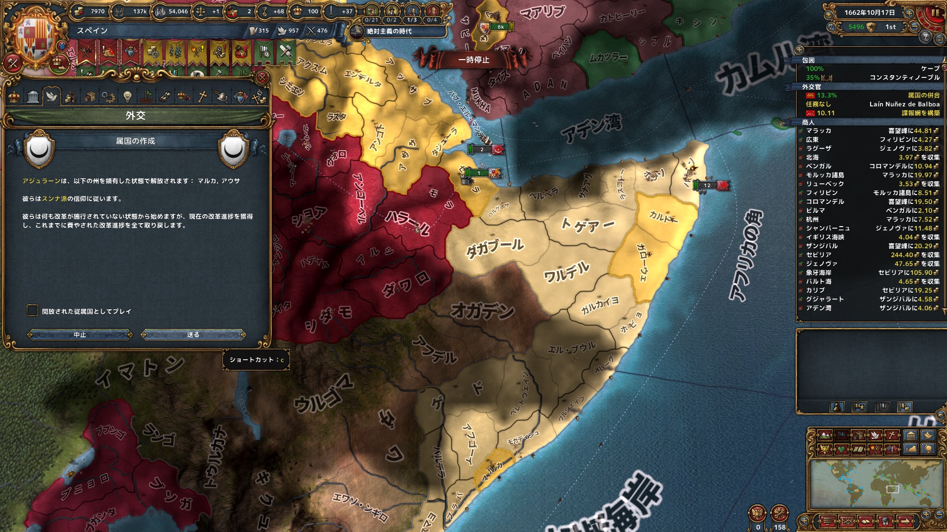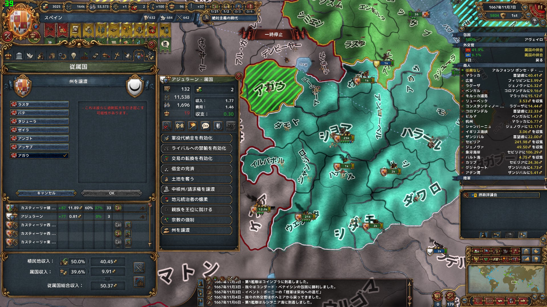 反面、州を大量に取れる一方で、普通に征服コア化をしようとすると、今度は過剰拡大や消費するADMの方がすぐに限界に達してしまうので、それ以上に拡張するためには本来の属国のコア州回収以外の土地を吸収させてコア化してもらう作業が重要になってきている。