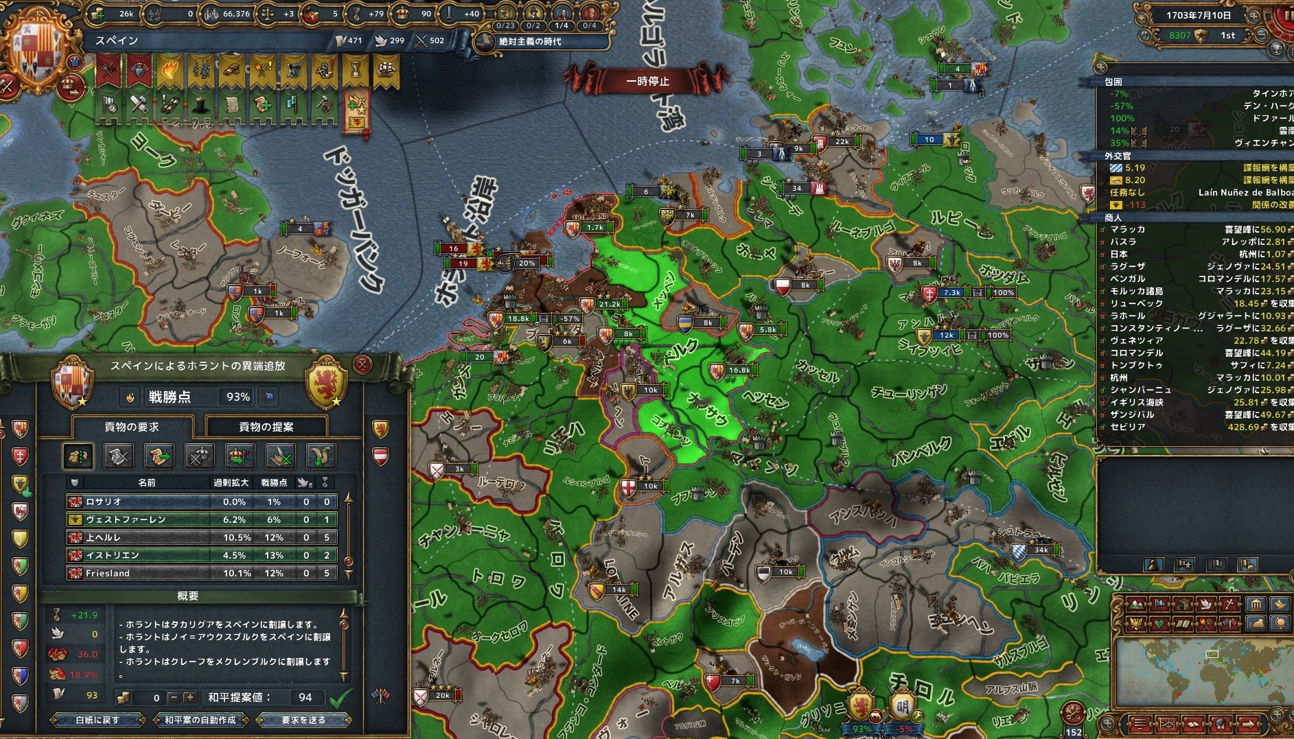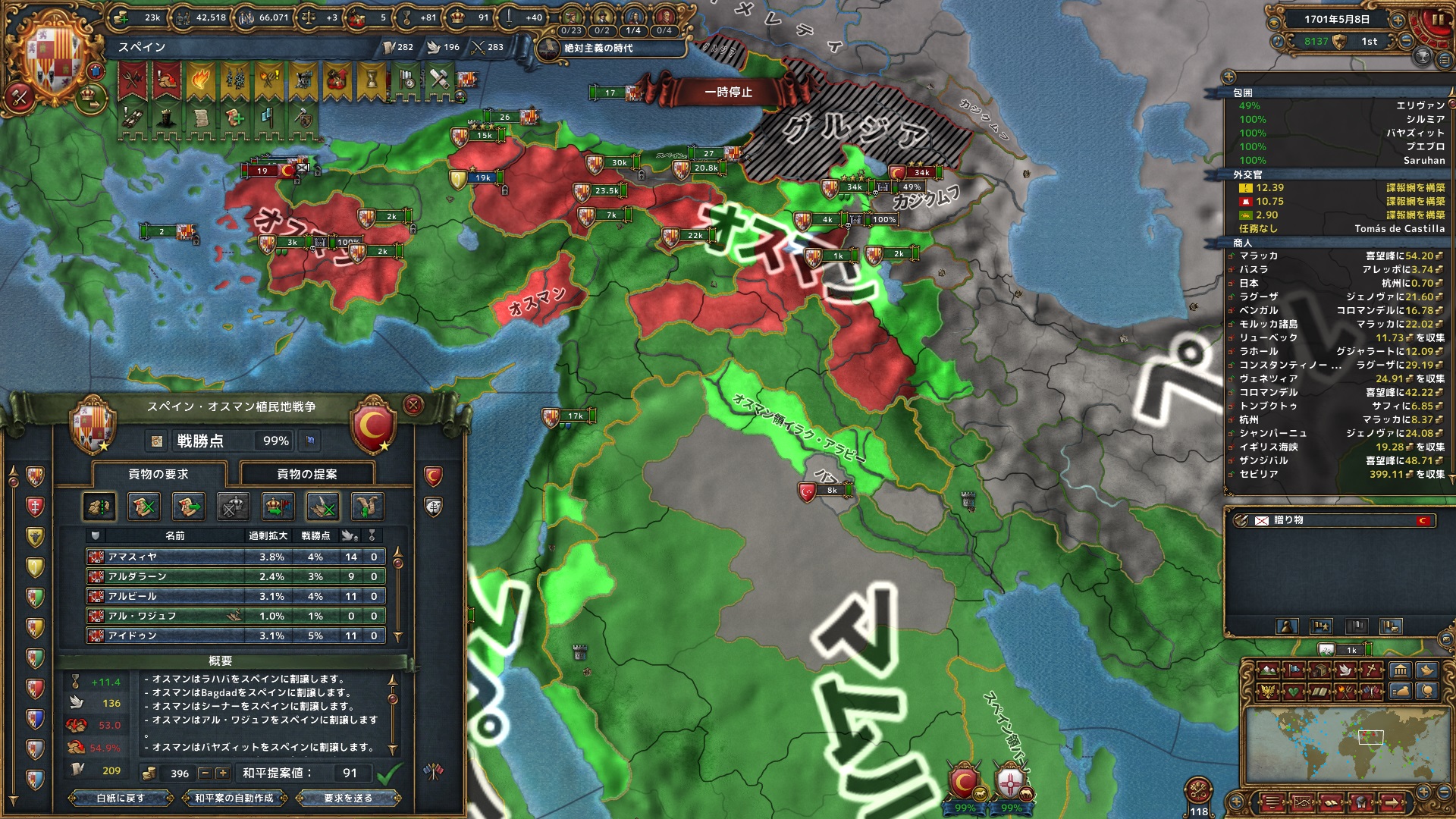 この頃の宣戦のパターンとしては、まずスペイン本国の過剰拡大100%限界近くまで占領地を詰め込んだ後、属国で過剰拡大に余裕がある国があったらその隣国を見つけて宣戦し太らせるというルーチンになっている。