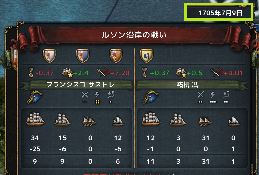 7月 ルソン沿岸の戦いで、主力艦隊を明艦隊にボロボロに破られる。倍以上出して勝てないというのは、技術差かなぁ。外交技術を遅らせているので二層甲板などの新式艦が作れない。