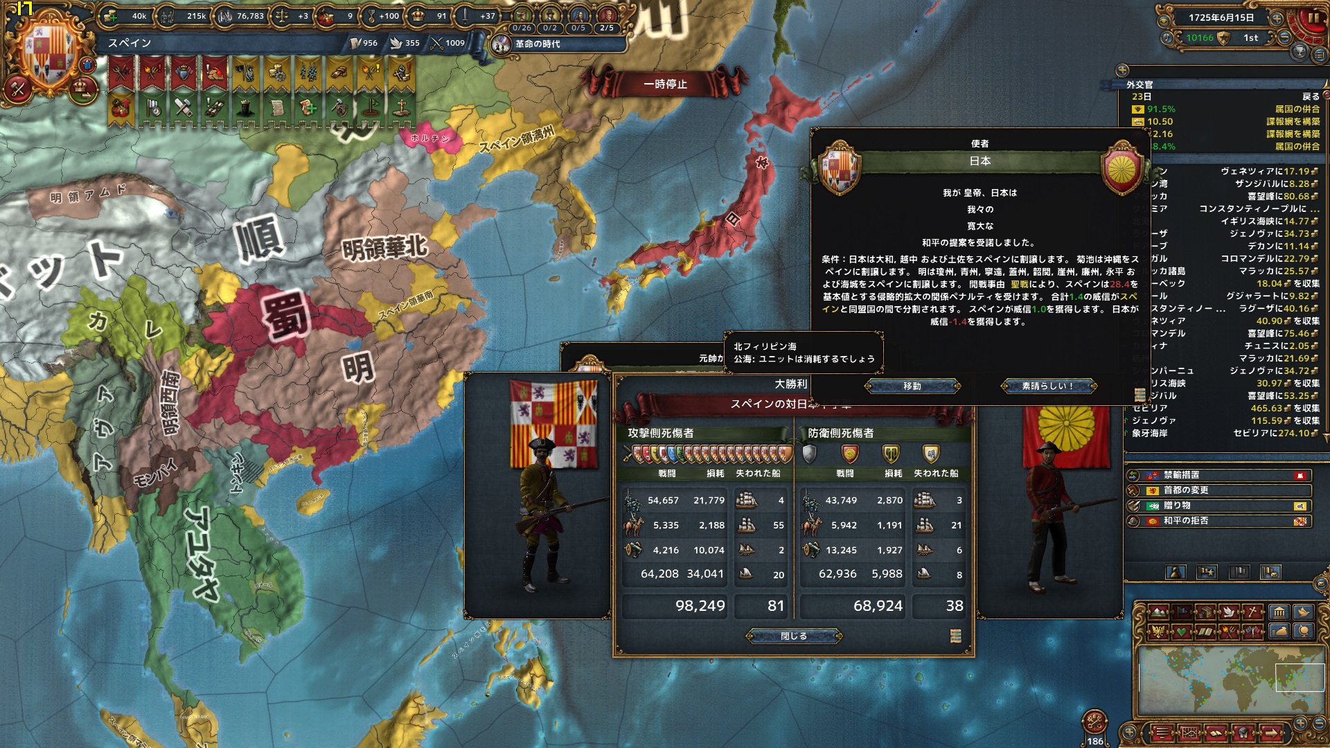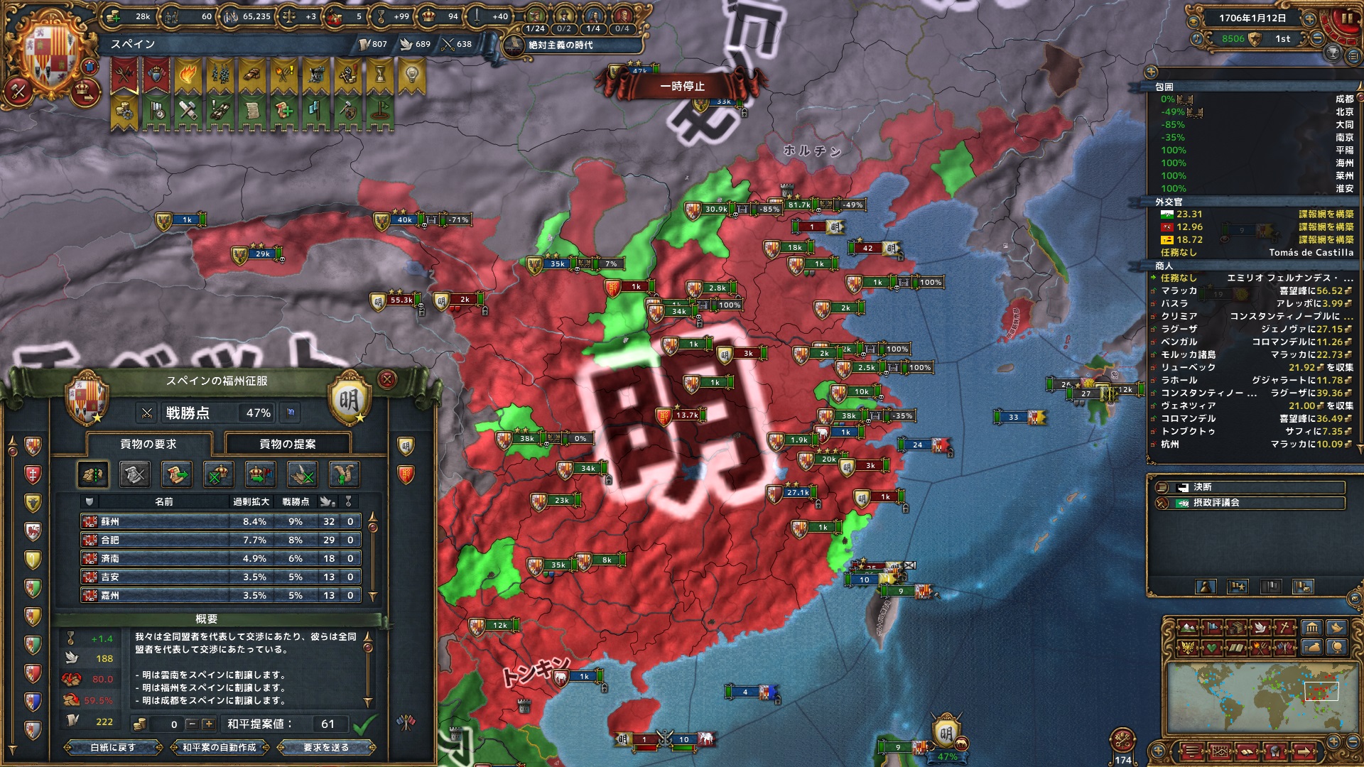 6月 日本、明、菊池と停戦。沖縄に生き残っていた菊池は完全併合。日本からは3州獲得で、城塞州を全て奪った。明からは9州を割譲させ、この後蜀と順に譲渡する。絶対主義値の補正をを活かして少しでも多くの州を獲得するためには、停戦時の割譲先を属国ではなくスペイン本国にする必要がある。