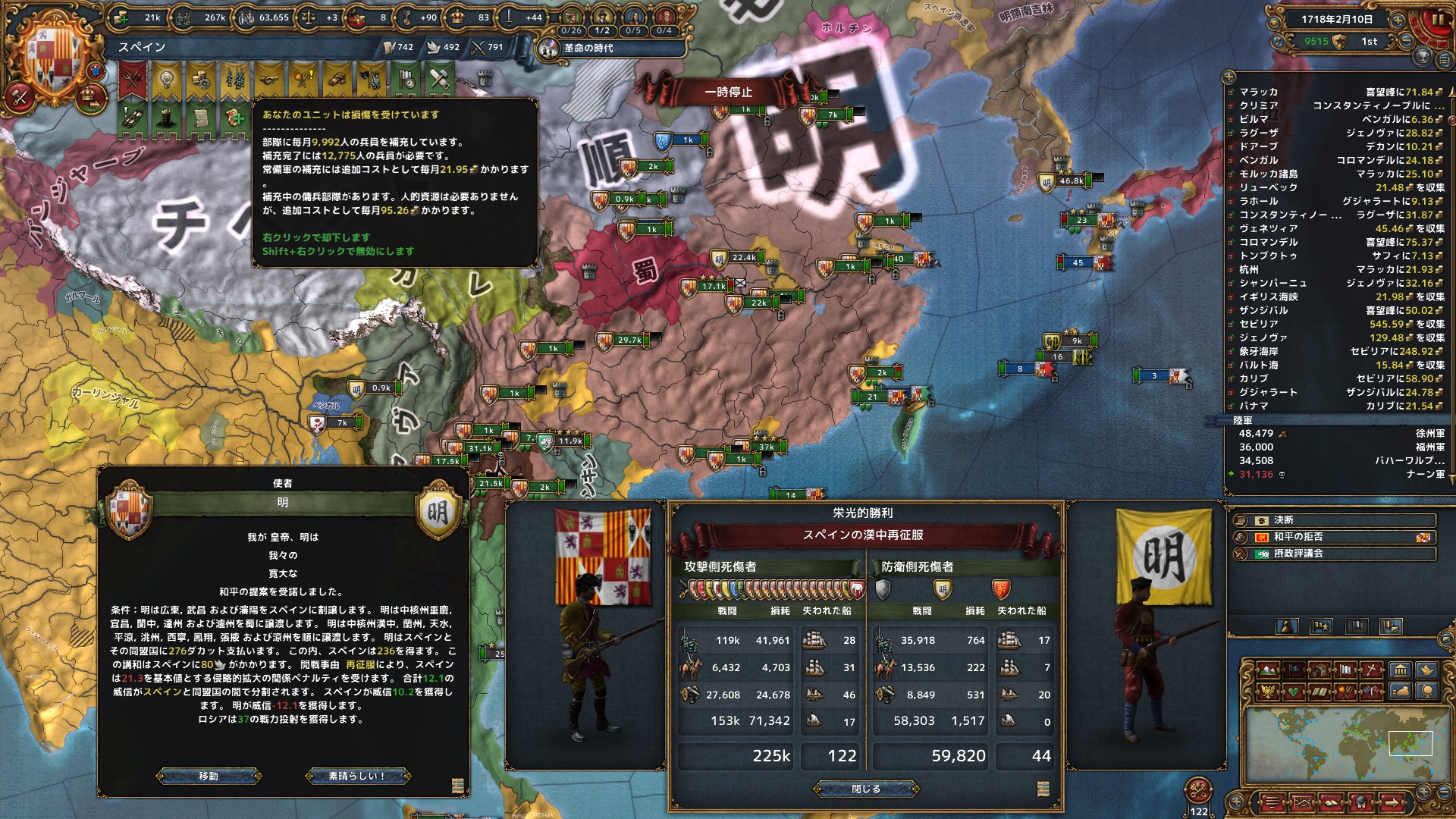 3月 雲南の戦いで明軍2万5千を殲滅。一度崩れた明軍は集結したスペイン軍の数の圧力に拮抗する戦力をまとめられない状況に。万単位の軍を6桁の軍で各個撃破する戦いが続く。それでも損害はどっこいだったり、スペインの方が多かったりしている。
