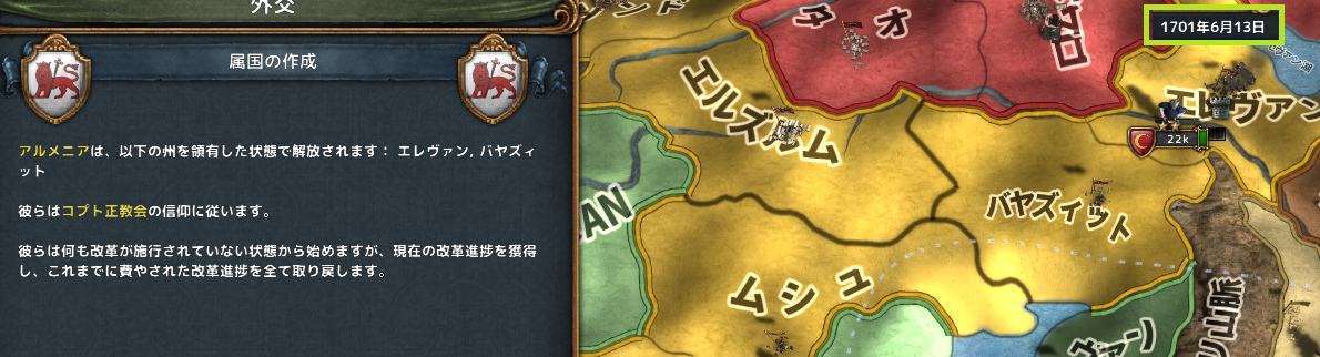 バスラは全土併合し、ペルシャからは9州を獲得。地続きの4州をアルメニアに取らせる。