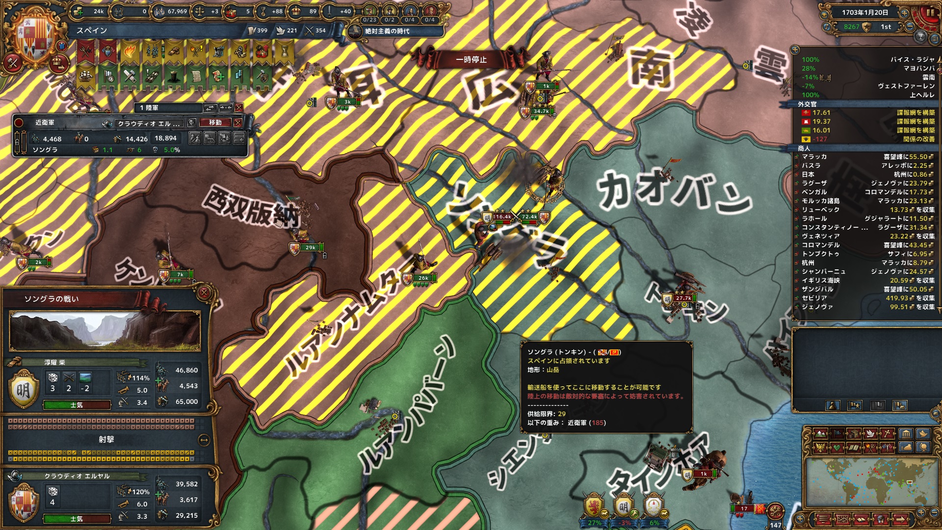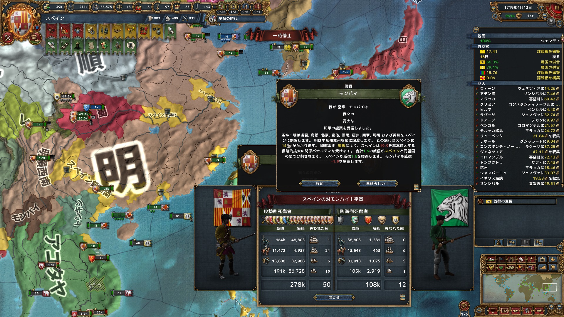 3月 雲南の戦いで明軍2万5千を殲滅。一度崩れた明軍は集結したスペイン軍の数の圧力に拮抗する戦力をまとめられない状況に。万単位の軍を6桁の軍で各個撃破する戦いが続く。それでも損害はどっこいだったり、スペインの方が多かったりしている。