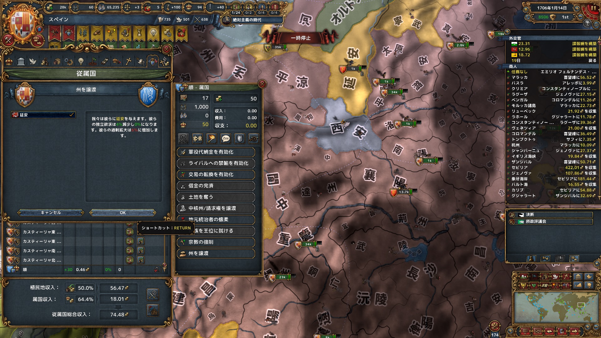 隣接した獲得州をさっそく譲渡して食わせていく。城塞州と城塞州を接続するようにパズル的に取った領土だが、都合よく、本来の順の中核州ではない州の構成になっている。順の中核州はまた別の機会に再征服を狙うことができる。AEももう大して関係なくなってきているが気持ち的に。順国は計5州に成長。