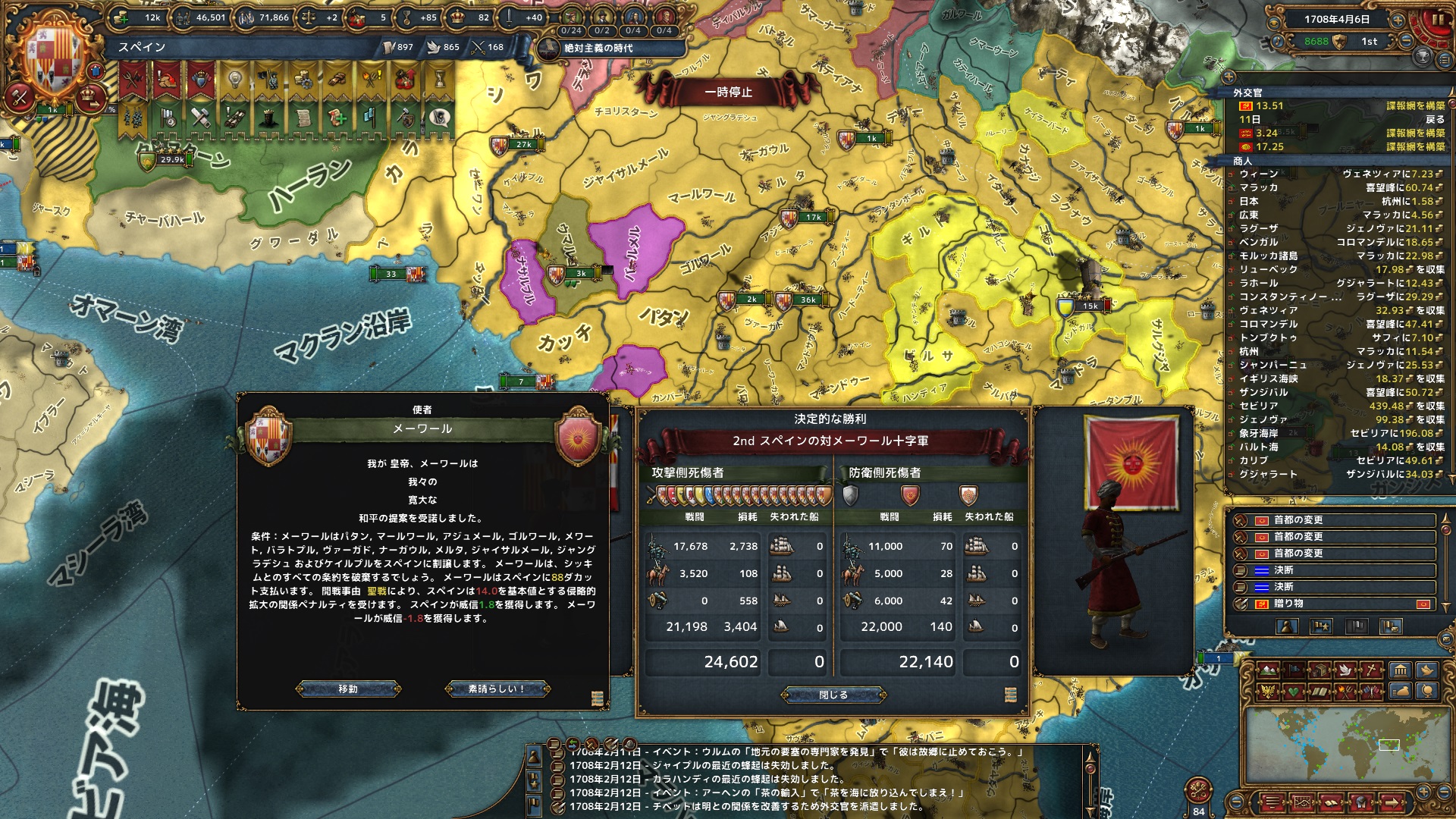 5月 バスラ、ペルシャと停戦。ペルシャは明、ロシアに次いでまだ大国の国力を残しており、中国戦線からも陸軍を回してさらに上回る大兵力で踏みつぶした。