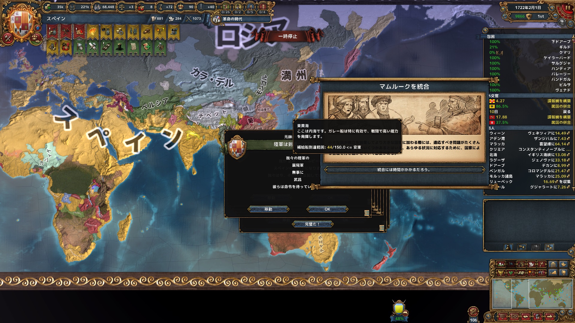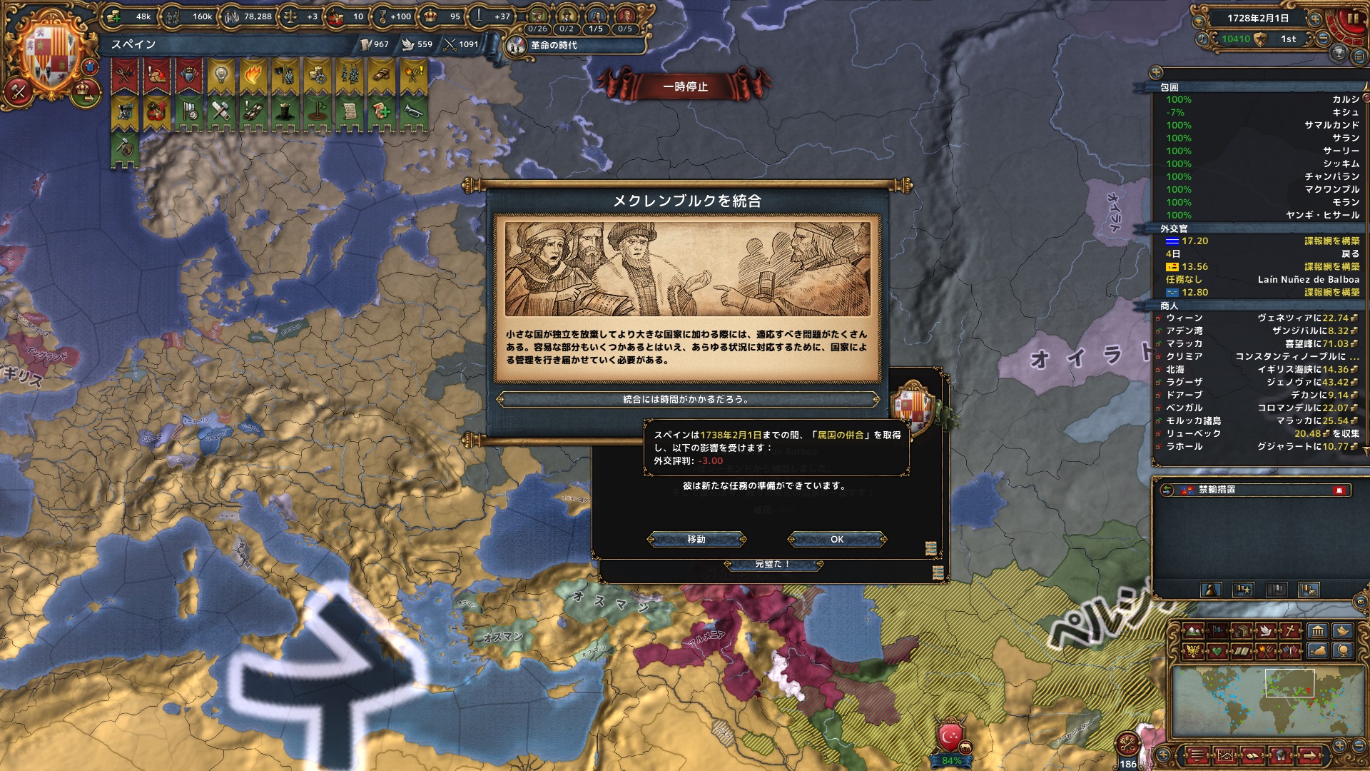 11月 都合のいいことに革命の時代の能力で無制限征服を獲得。中核化や割譲の際の州の距離の制限がなくなる。