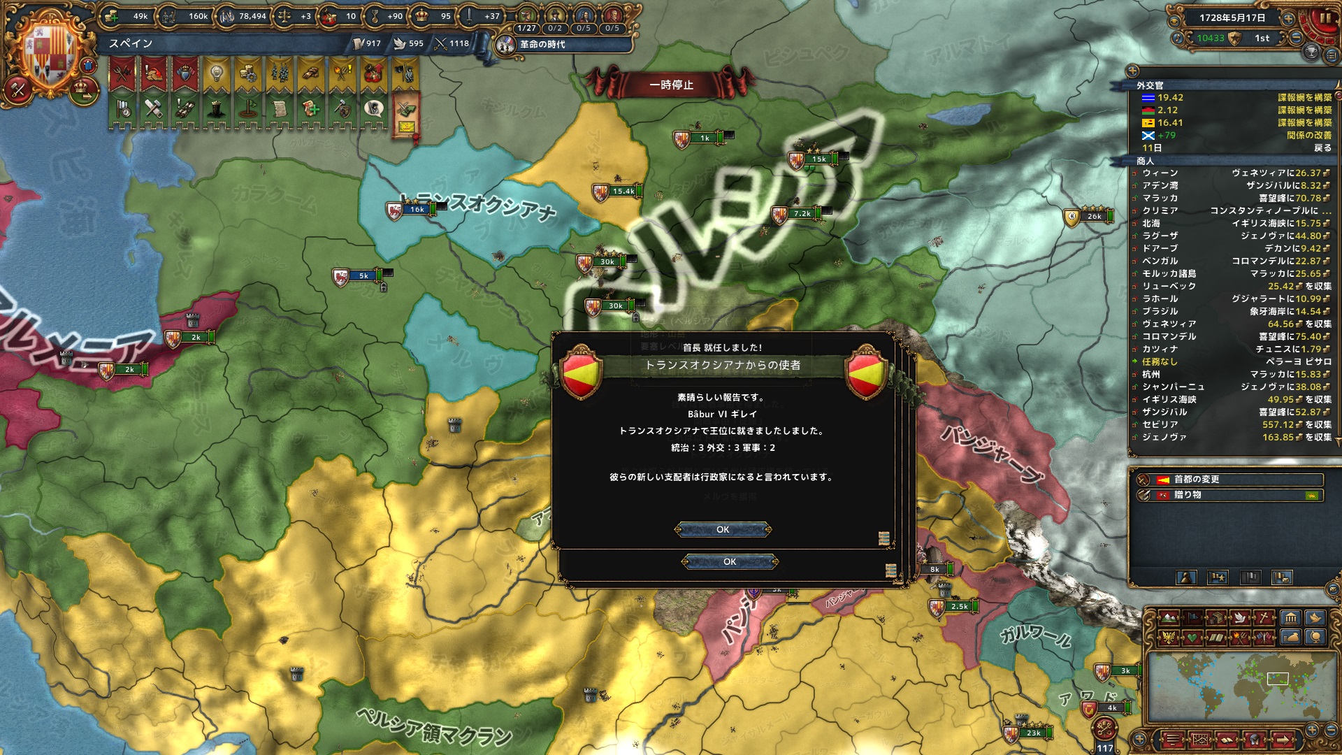 続けて戦争すると、明から奪った領土の中核化が交戦中は止まってしまうことに気づき、中核化が済むまで明への攻撃は一時休止。その間にビルマやヨーロッパで開戦し拡張していく。また、今まで世話になったアユタヤとの同盟もここで破棄。