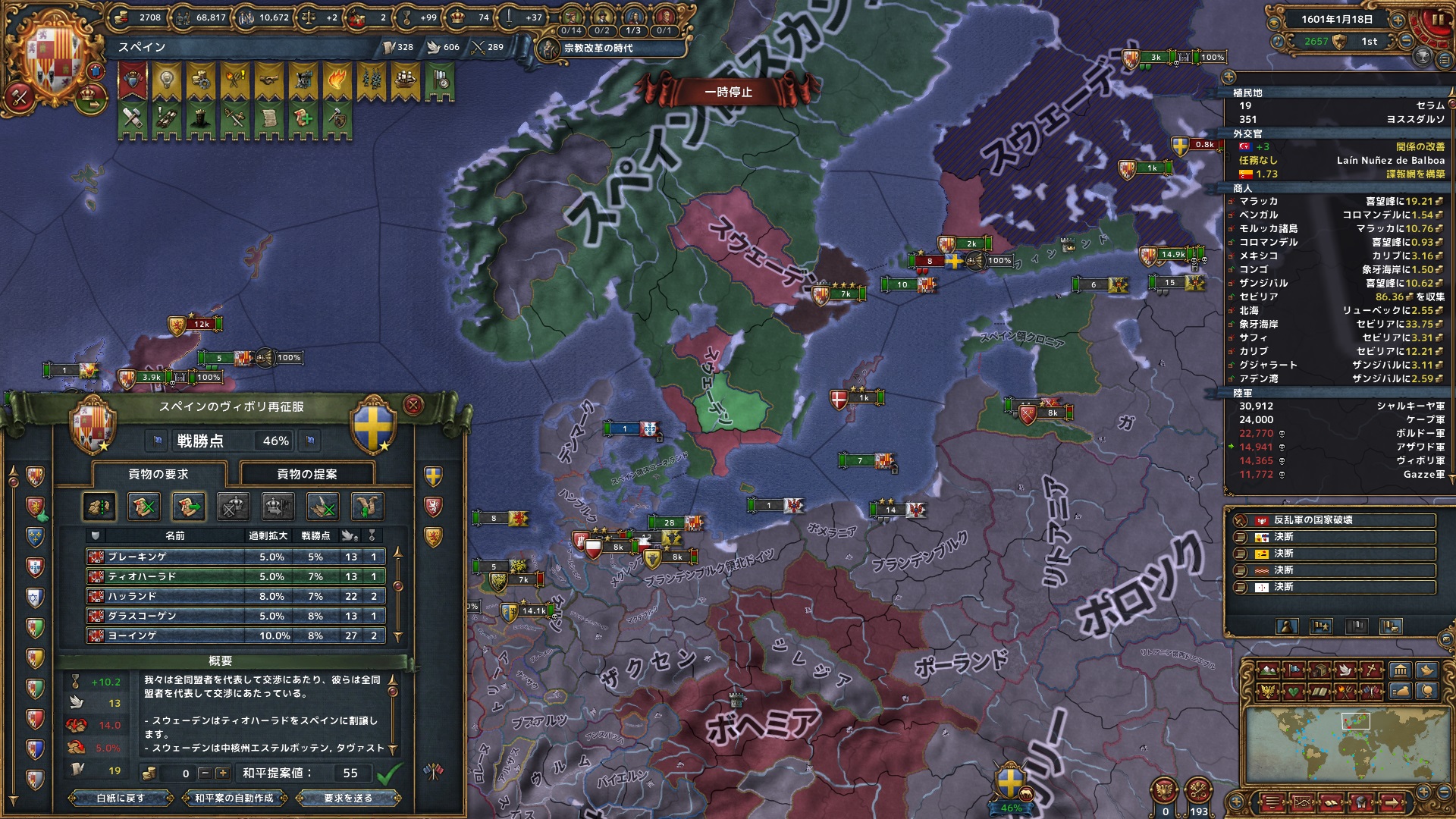 1月 スウェーデンと停戦。フィンランド中核州8州すべての返還に加え、スペイン本国も1州を獲得した。