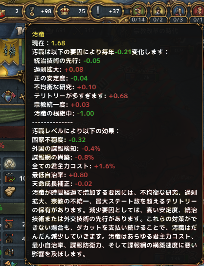 この頃、放置気味だったステート枠を目いっぱい使って可能な限りテリトリー数を減らすことに取り組んでいる。テリトリーが多すぎて汚職への悪影響がかさんでいたのに気づいた。