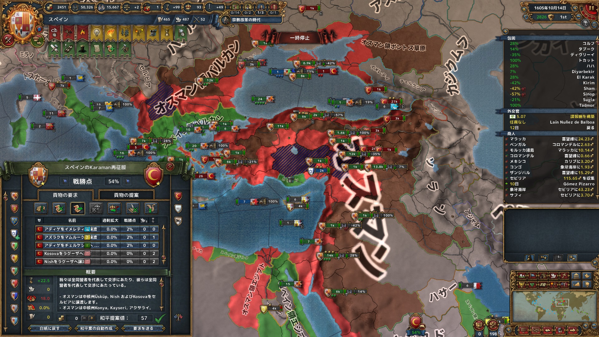 10月 戦勝点は十分稼げたので、今回はカラマンのコアを全て返還と、ついでに勇ましい我らがセルビアのコアも返還してもらって停戦。