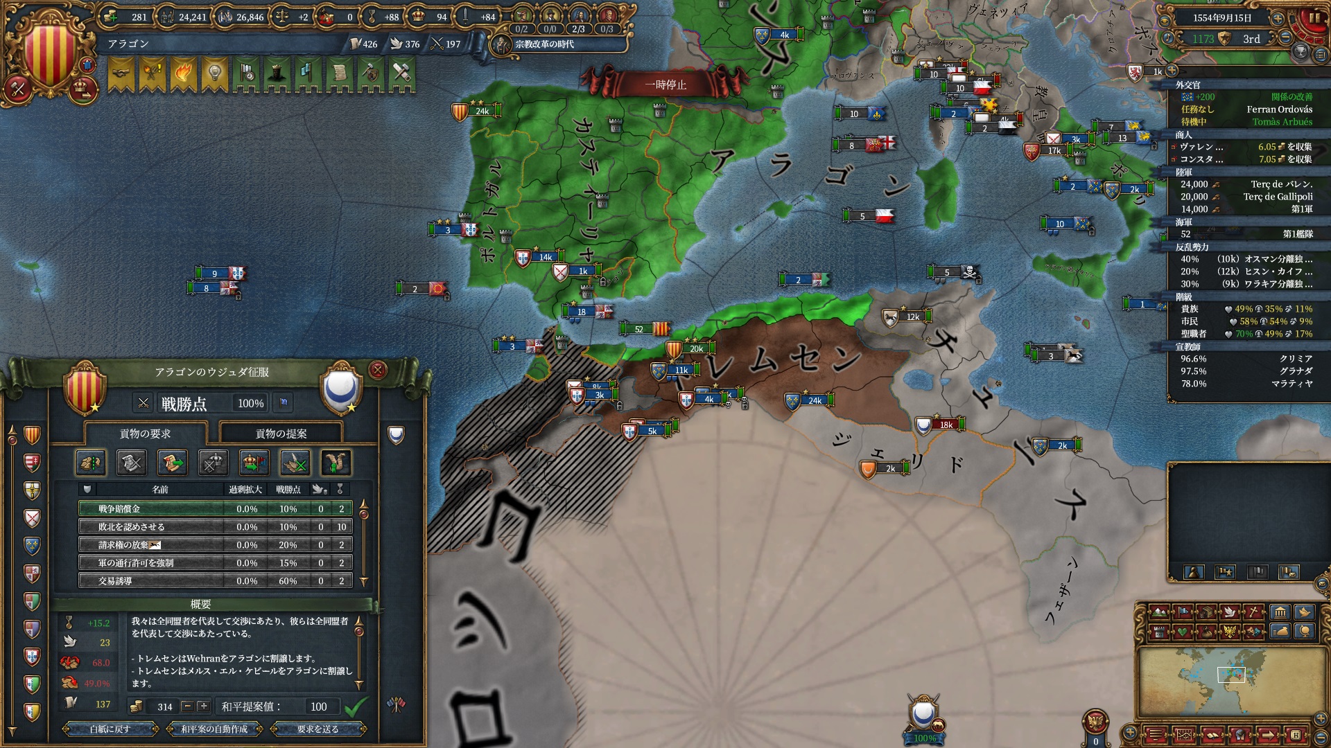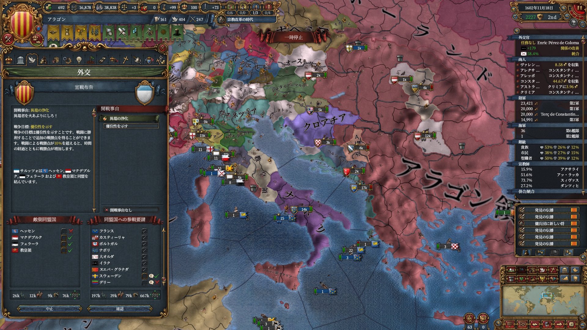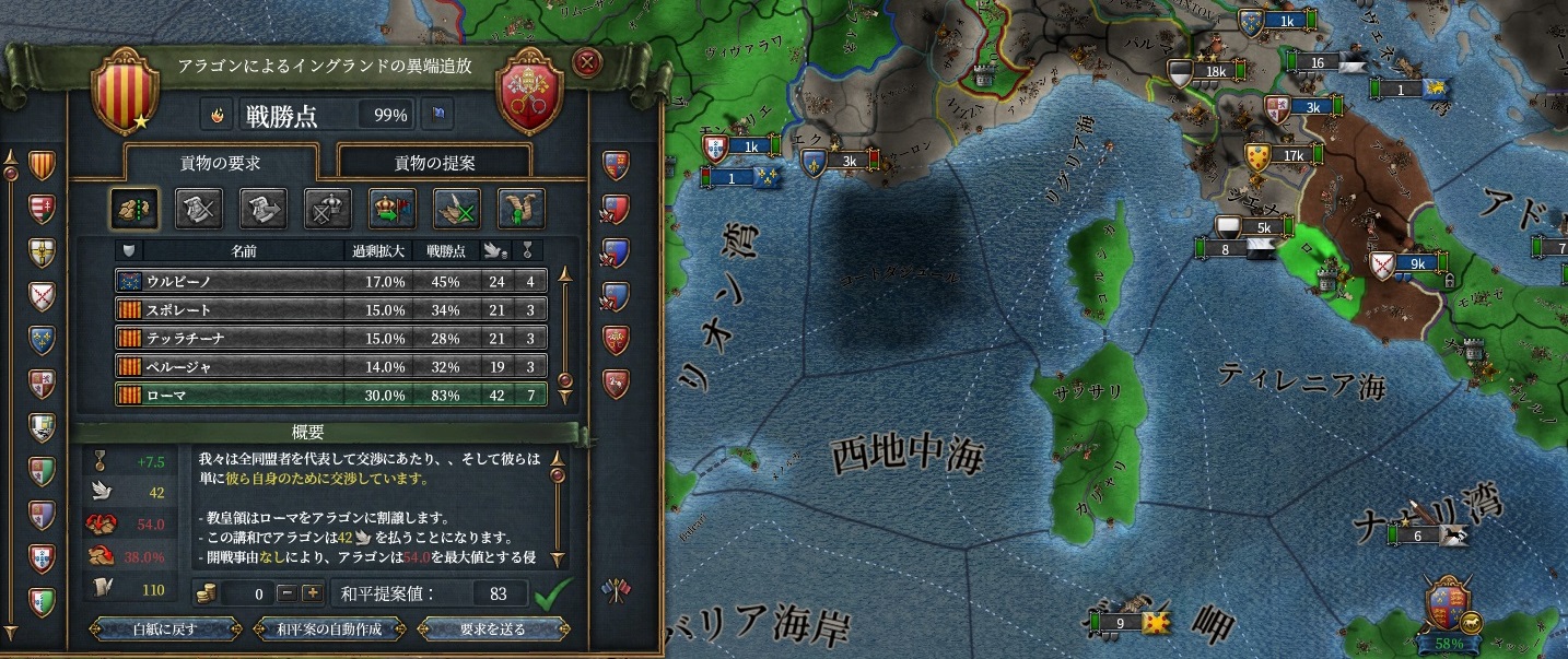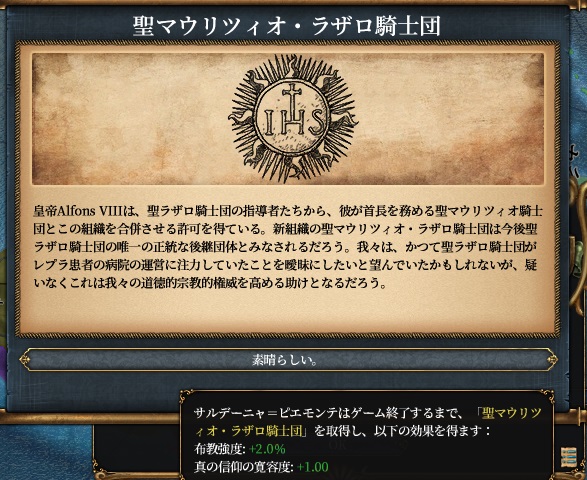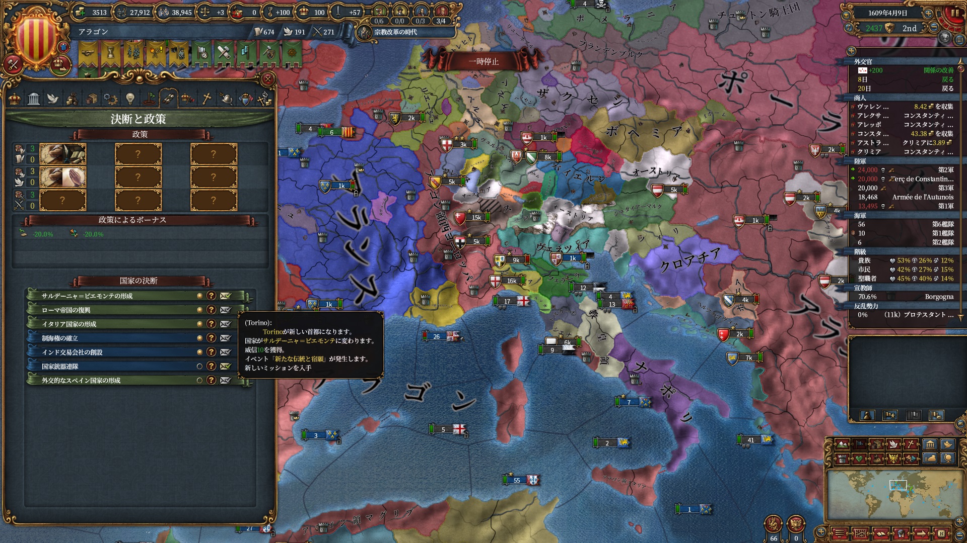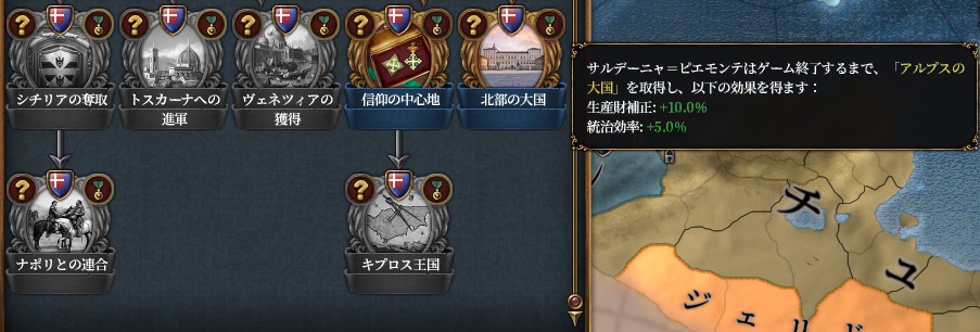 外交併合コスト-10%を得られるミッションはサヴォイ地域の統一→ジェノヴァ征服→サルデーニャ島征服→シチリア島征服→ナポリ征服と続くツリーですが後半はアラゴンなら初期から達成済の領地であり簡単に恩恵を受ける事が出来ます。