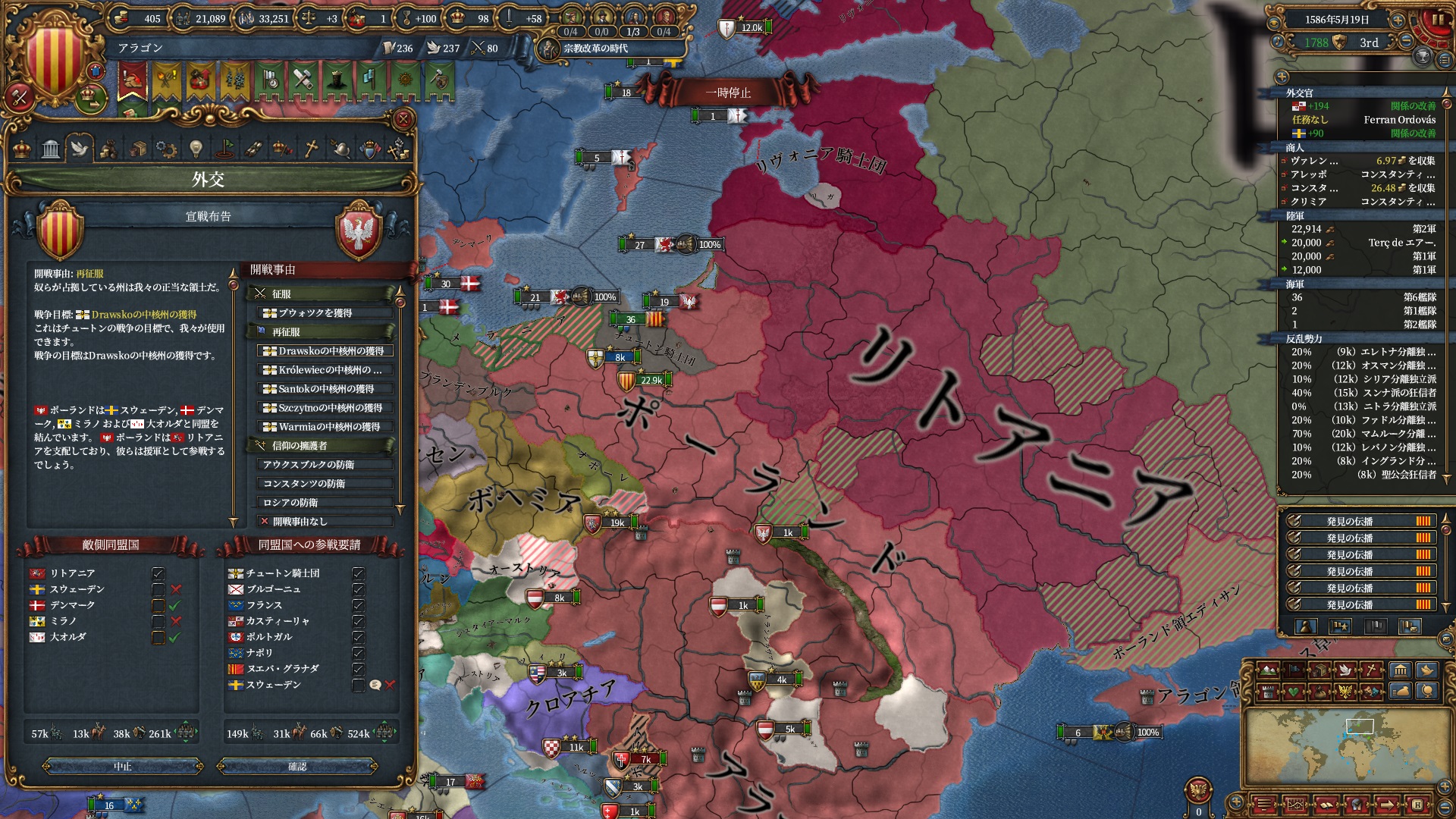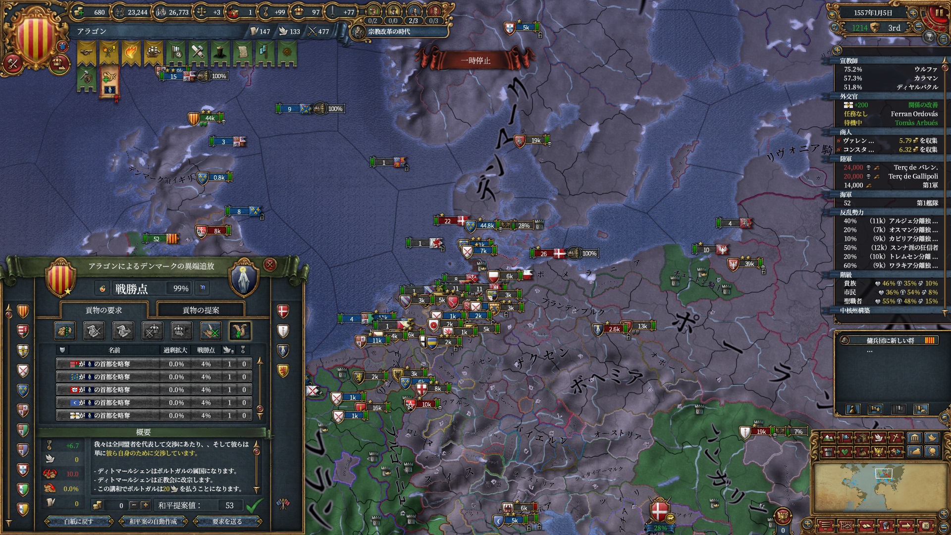 HRE諸国+皇帝と同盟のロシア辺りとドンパチやっていました。スウェーデンも参戦出来ないようなので横から殴ります。